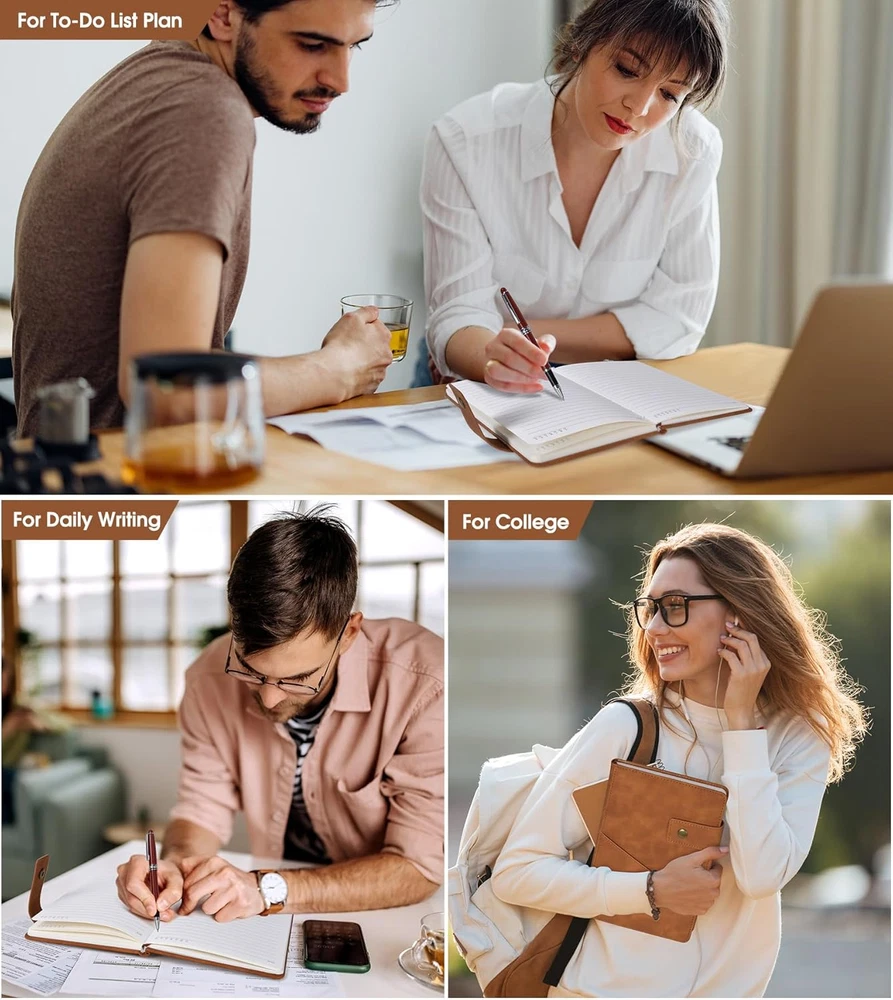 【VALUE OF MONEY HARDCOVER JOURNAL SET】: Classic brown ruled notebook, journals are elegant, quality crafted books available at a surprisingly competive price and quality. A huge choice for everyday use, provides plenty of space for notes, lists, musings, and more. And each notebook will give away a luxury pen, this is one of our best journal pens gifts. 【PREMIUM THICK PAPER】:5.9 X 8.4 inch journal notebook with 200 pages 100 gsm lined paper, thicker 30% than normal, this brown notebook is designed to avoid feathering and the paper is ink-proof, suit for most pens, but the wettest pen inks. Archival-quality pages made from acid-free paper-resists damage from light and air, the cream paper is easy on eyes.Let your creation more freedom on the wide ruled journal to write in. 【SOFT FAUX LEATHER JOURNAL NOTEBOOK】:This elegant Journal notebook has suede hardcover but feel soft in hand, just like a baby's skin. Fashion but reliable cover adapts to the movements of body without damage. The notebook's hard cover protects the pages inside and doubles as a convenient writing surface. Great gift for any. 【GUSSETED DESIGN】:Gusseted pocket design and cardboard bound cover, metal buckle helps keep notebook securely closed, making it easy to write in the notebook from just about anywhere. This notebook provide you a high quality writing experience. expandable gusseted pocket for stashing loose notes,business cards, receipts, mobile phone, or other small items. 【GREAT USE & PERFECT JOURNAL GIFTS】:Ideal for all office, school and home use,including for taking notes and keeping work in order,as a diary or journal for brainstorming ideas, creative writing or just doodling and drawing to your hearts content.This personalized journal notebook is a great birthday, mothers day, fathers day, children's day, graduation, christmas journal gifts. It is an ideal gift for mom,dad, teachers, wife, husband, friends, daughters, sons and granddaughter. Product Description VFAEJLL Journal Notebook Hardcover Leather Journal Notebook Soft Business PU Leather Diary Notebook A5 Journal Notebook Travelers Thicken School Office Meeting Record Notepad Handbook Gift Vintage Business Notebook Classic business simple atmosphere Retro texture fabric, innovative human design, thickened paper. Journal Notebook with Metal Signature Pen journal measures 5.9'' wide x 8.4'' high Unique cover gusseted pocket design Convenient pen insertion design, convenient application Silk ribbon with bookmarks for easy reference. Can record your diary, travel journal and note. Clear printing, soft and comfortable touch feeling, making you write smoothly and well. It is a great notebook for you to make everyday plan, making your things organized. Great for projects, writing lists, keeping notes and everyday use at home, office or school. Record your valuable thoughts, memories and experiences in this classic notebook. It is good for students, businessmen, teachers, professors and so on. Travel Journal Dream what you want to dream, go where you want to be, and be who you want to be. Because you only have one life and one chance to do all the things you want to do. A Wonderful Journal Gift Give a gift that communicates you value your loved one’s ideas. Luxury pen Using high quality steel penholder, high density, corrosion resistance, multi-layer piano paint surface, bright as new after long-term use, paint will not drop.Parker style refill supplied with black German Ink. Tip size: 0.5 mm. Perfect pen for journaling. Leather Notebook Cover with Elastic Pocket A5 Business notebook cover with pocket design, can be placed mobile phone, pen, etc.Copper fastener, business temperament, low-key atmosphere. High-quality sheepskin leather,soft and comfortable to the touch, and the texture is clearly visible. High Quality Writing Journal We use 100gsm thick paper, thicker than most other brands of paper, you can feel the quality and durability that make it one of our most popular writing journals, ensuring every page is resistant to ink bleeding, erasing , ghosting and shadows. High-density Ribbon Bookmark Durable, easy to mark and search 200 Pages Lined Paper he notebook has 200 pages with 20 lines on each page and 9mm spacing.