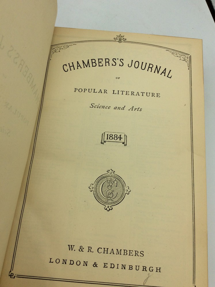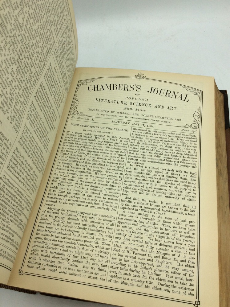 CHAMBERS'S JOURNAL of Popular Literature, Science and Arts (Fifth Series, 1884) London/Edinburgh: W. & R. Chambers, 1884. Leather. 832p. A hardcover book bound in 3/4 leather with brown cloth boards, marbled endpapers, and marbled foredges. FAIR condition. Several small chips off the spine, boards weakly attached, and corners rubbed. A couple of pencil markings on the first few leaves; otherwise, text clean and pages tightly bound, despite the worn cover. Item #186510 A bound volume of CHAMBERS'S JOURNAL, a weekly British literary magazine, containing all issues from January 5 through December 27, 1884. Includes installments of BY MEAD AND STREAM by Charles Gibbon, ONE WOMAN'S HISTORY and TWO DAYS IN A LIFETIME by Thomas W. Speight, and scientific articles such as "Is Smoking Injurious to Health?" and "Curiosities of the Electric Light."