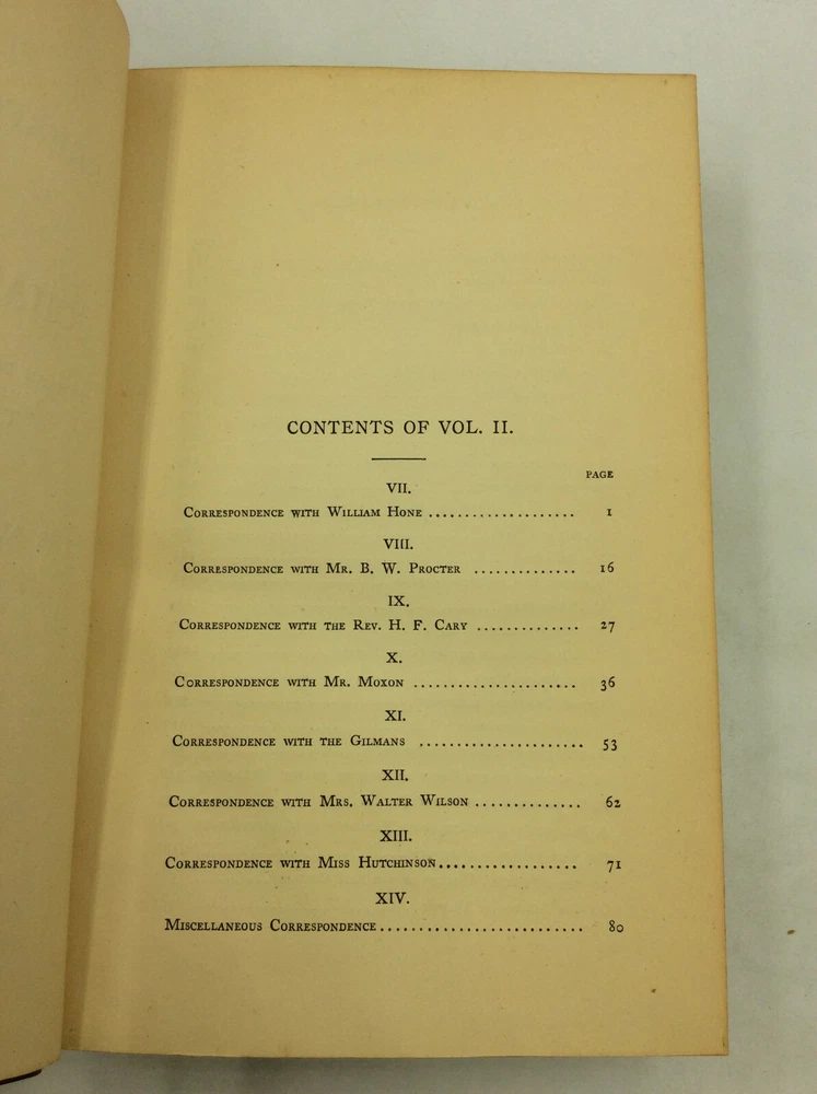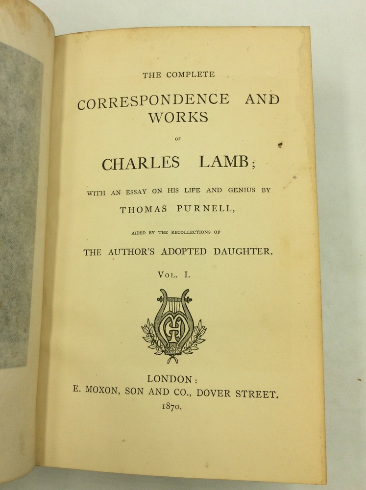 Charles Lamb THE COMPLETE CORRESPONDENCE AND WORKS OF CHARLES LAMB: Vols. I-IV London: E. Moxon, Son, and Co., 1870. Leather bound. Complete four volume set. Bound in 3/4 brown leather and marbled boards. Gilt decorated spines with red/green labels; marbled edges and endpapers. Neat bookplate on inside front cover of each volume else clean and unmarked. Slight touches of shelfwear but overall an attractive, solid set in very good to fine condition. Item #1230759 Includes "an essay on Lamb's life and genius by Thomas Purnell aided by the recollections of the author's adopted daughter" This book is offered by Kubik Fine Books Ltd. Established in 1985, our store is in Dayton, Ohio, and specializes in rare/antique books of all types, with a special emphasis on history and theology. We are a member firm of the two most prestigious organizations in the rare books trade: the Antiquarian Booksellers Association of America (ABAA) and the International League of Antiquarian Booksellers (ILAB). As such, we are bound by their strict code of ethics and standards - in other words, you can trust us to be reputable, knowledgeable professionals. All items are guaranteed to be as described and can be returned for a full refund. Autograph material is guaranteed in perpetuity to be authentic. ORDER ADDITIONAL BOOKS AND SAVE! We will combine shipping on multi-book purchases. For shipments within the USA, shipping is $2.00 per book for each additional one purchased. Orders must be paid for at the same time. A FEW WORDS ON SHIPPING: Our shipping charges may be higher than other sellers. That's because we have a dedicated shipping employee and take care to make sure your orders are well-protected. Every item is wrapped in bubble-wrap; in addition, everything item which sells for over $10 is shipped in a sturdy cardboard box with cushioning materials. Over 95% of our orders are shipped within one business day of when we receive payment. If you buy it tonight, it's en route tomorrow!