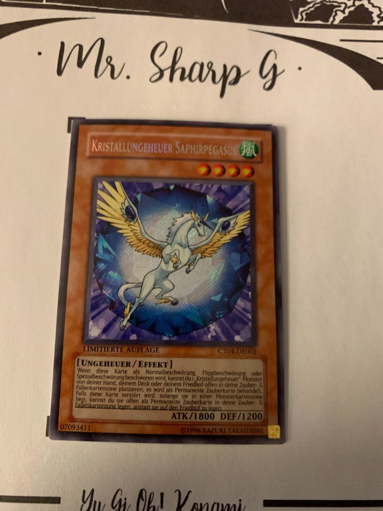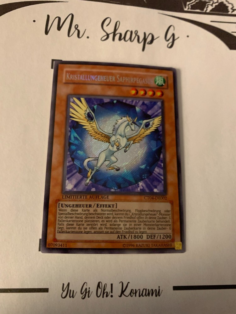 - Mr. Sharp G - - Online Store - TRADING CARDS-TCG-COLLECTION-SETS-TOURNAMENT-Yu Gi Oh! Konami * * * KRISTALLUNGEHEUER SAPHIRPEGASUS - LIMITIERTE AUFLAGE CT04-DE002 - Bitte schauen Sie sich die beigefügten Bilder an, um einen vollständigen Überblick über den Zustand jedes Artikels zu erhalten. - Zustand des Artikels: Neu* - in einem neuwertigem Zustand. (* Neuer Zustand - kann aber leichte Mängel wie 'whitening', leichte Eindrücke, Dellen u.a. haben - die von der Herstellung der Karte aus Produktion stammen, bitte den Bildern und in der Beschreibung den Zustand entgegennehmen) - Typ/ Serie: UNGEHEUER/ EFFEKT / LIMITIERTE AUFLAGE CT04-DE002 - Seltenheitsstufe/ Rarity: SECRET RARE - Edition : COLLECOTR'S TIN 2007 / 2007 * * * + Kartenschutzhülle & Toploader inklusiver im Preis + mehrfache Bestellung = einmalige Versandkosten + versicherter Versand Bestellung in Höhe - v. 8,50EUR in Deutschland/ Inland - v. 12,50EUR im Ausland/ International + Großbestellungen kostenloser Versand Inland und International - Bei Fragen, Details, nicht im Bestand gewünschte Karten/ Artikel oder Versandgutschriften schreiben Sie uns! Wir freuen uns auf Ihre Nachricht! - Vielen Dank für Ihr Vertrauen, Unterstützung und Besuch in unserem Store ! - Ihr Mr. Sharp G Team