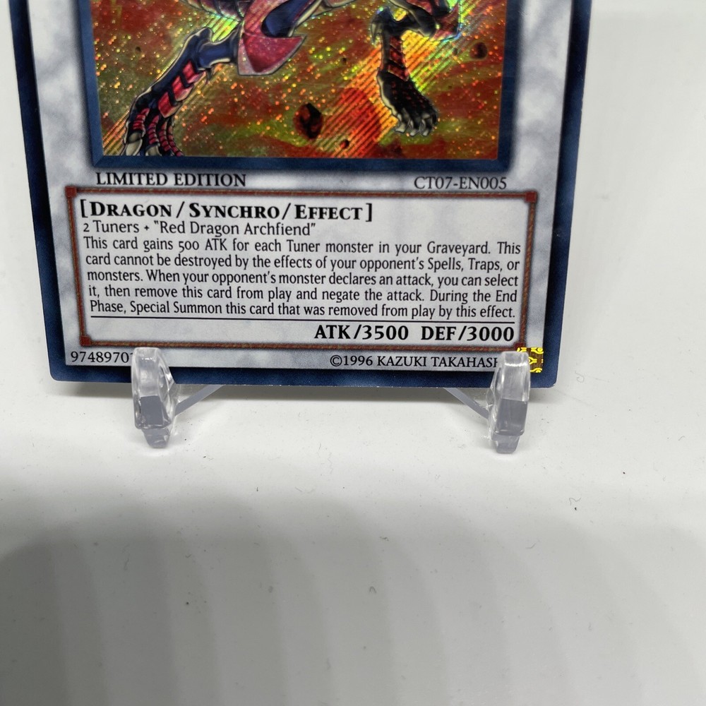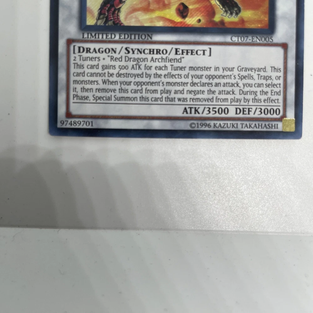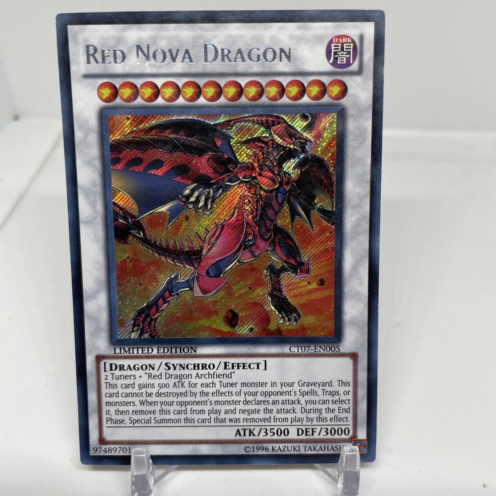Unleash the power of the Red Nova Dragon with your Yu-Gi-Oh! TCG collection. This Secret Rare, Limited Edition card boasts an attack power of 3500 and a defense toughness of 3000, making it a formidable addition to any deck or display. The holo finish captures the fiery essence of this dragon, ensuring it stands out in any collection. The Red Nova Dragon card, CT07-EN005, is a treasured piece from the year 1996, featuring the classic aesthetic that veteran collectors and new fans alike appreciate. As a notable card from the Yu-Gi-Oh! series, it's a must-have for those looking to enhance their game or preserve a piece of history.