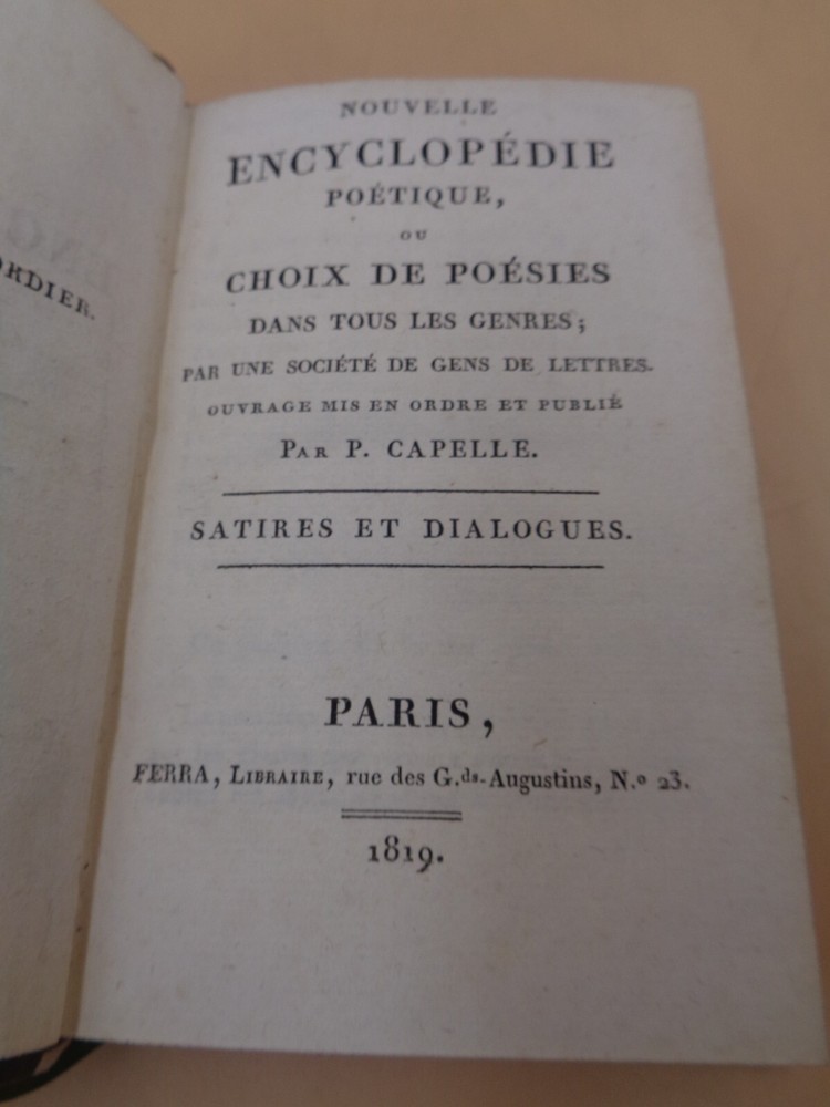 P. Capelle New poetic encyclopedia, ... Volume 11 Satires and dialogues Paris, 1819 Half sheepskin (13.5x8.5cm), 324 pages Binding a little rubbed otherwise good condition P. Capelle New poetic encyclopedia, ... Volume 11 Satires and dialogues Paris, 1819 Half sheepskin (13.5x8.5cm), 324Â pages Binding a little rubbed otherwise good condition