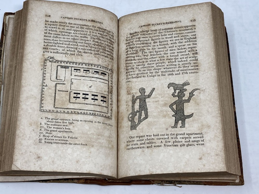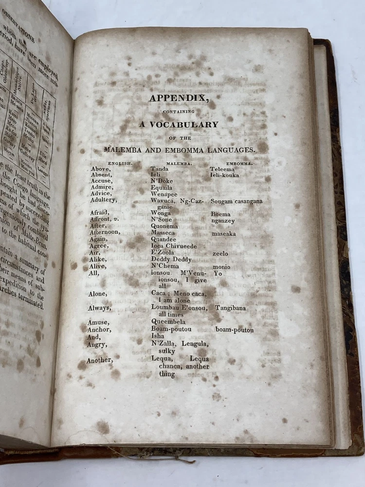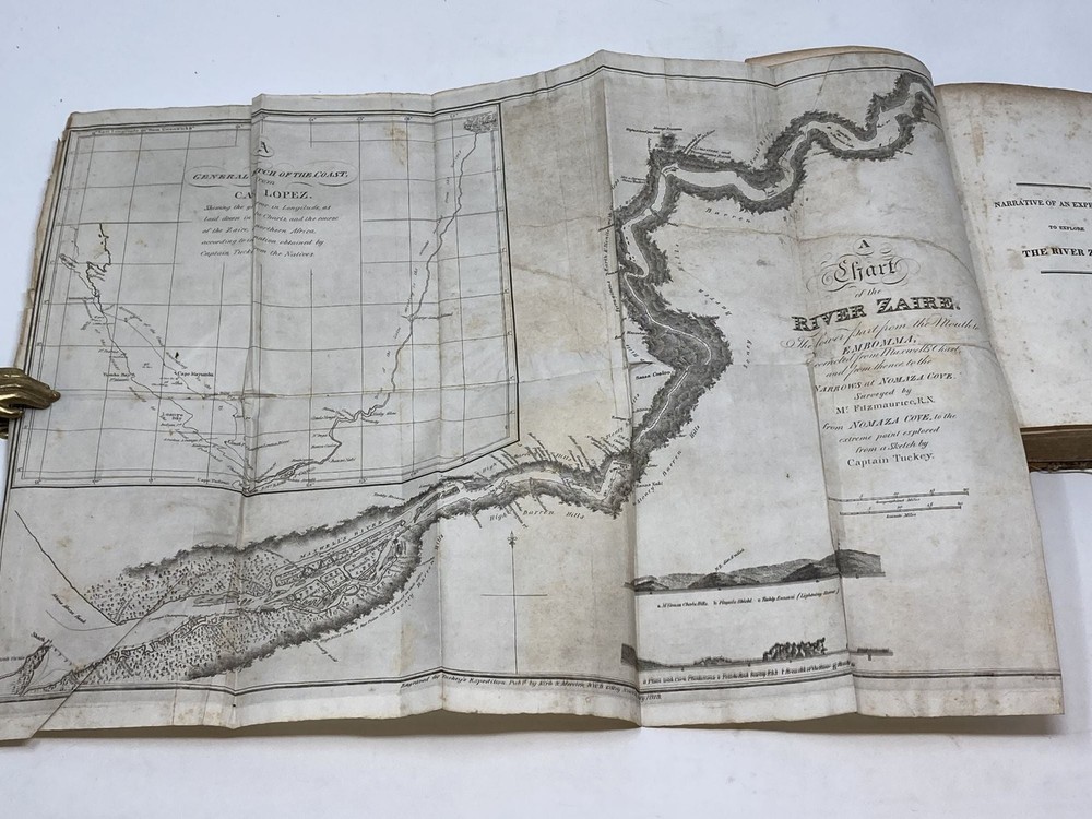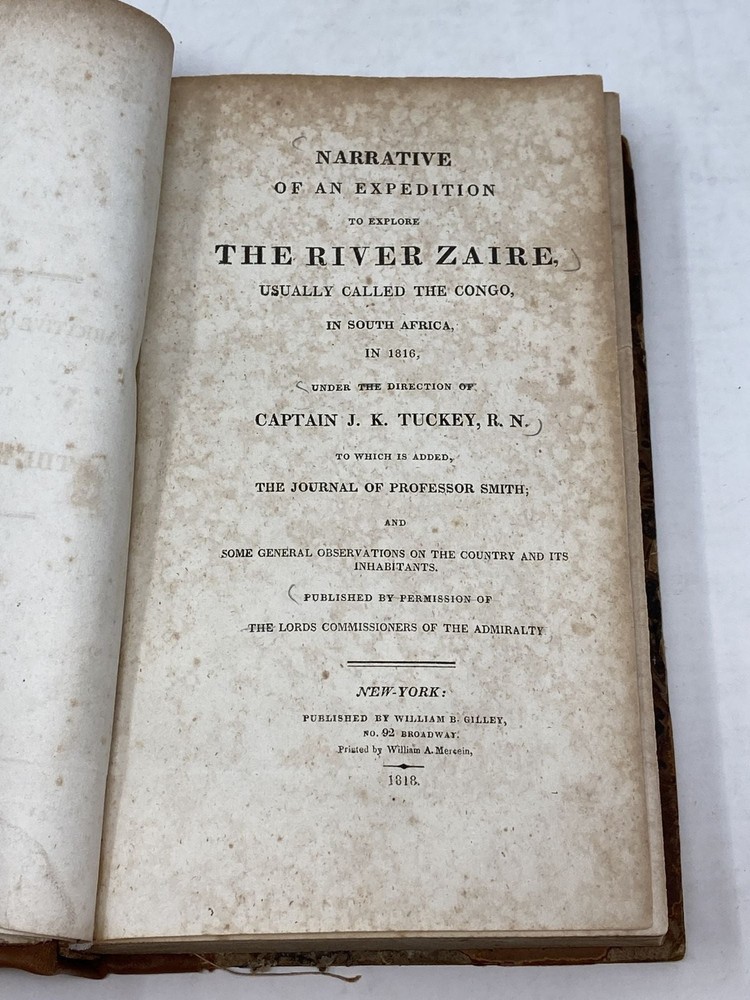 NARRATIVE OF AN EXPEDITION TO EXPLORE THE RIVER ZAIRE, USUALLY CALLED THE CONGO IN SOUTH AFRICA IN 1816, UNDER THE DIRECTION OF CAPTAIN J.K. TUCKEY, R.N., TO WHICH IS ADDED, THE JOURNAL OF PROFESSOR SMITH; AND SOME GENERAL OBSERVATIONS ON THE COUNTRY AND ITS INHABITANTS Author: Tuckey, Capt. J.K. Title: NARRATIVE OF AN EXPEDITION TO EXPLORE THE RIVER ZAIRE, USUALLY CALLED THE CONGO IN SOUTH AFRICA IN 1816, UNDER THE DIRECTION OF CAPTAIN J.K. TUCKEY, R.N., TO WHICH IS ADDED, THE JOURNAL OF PROFESSOR SMITH; AND SOME GENERAL OBSERVATIONS ON THE COUNTRY AND ITS INHABITANTS Publication: New York, New York: William B. Gilley, 1818 Description: Leather-bound. 3/4 leather with marbled paper sides. Recent rebacking with fresh butterscotch calf spine. Five raised bands (plus top and bottom of spine) each hub with gilt to above and below. Moderate foxing and browning throughout, heavier toward the beginning and end, but text still easily readable. Vocabulary appendix. Good Plus. James Hingston Tuckey (1776-1816) was an Irish-born explorer and a captain in the Royal Navy...At the age oif 17 he joined the navy and went to sea, was engaged in expeditions to the Red Sea, and in 1802 helped expand the British colony of New South Wales in Australia. As first lieutenant of the ship The CALCUTTA, Tuckey was captured by the French and was imprisoned for 9 years. While a prisoner, he married Miss Margaret Stuart, a fellow prisoner. After his release, Tuckey was promoted to the rank of commander and in February 1816 sailed to explore the River Congo in the schooner CONGO, accompany by the stores ship DOROTHY... "Most of the officers and crew died of fever and Tuckey himself died on 14 October, 1816 at age 40, in Moanda...He was described as tall and had been handsome, but long and arduous service broke down his constitution and by thirty he was grey-haired and nearly bald...He was gentle and kind in his manners, cheerful in conversation, and indulgent to those under his command..." (Wikipedia). Seller ID: 83780 Subject: Travel and Exploration Aardvark Rare Books Eugene, OR We work hard to make your Bookbuying Experience safe, easy and fun. Aardvark Books is a proud member of the ABAA (Antiquarian Booksellers Association of America) and IOBA, Independent Online Booksellers Association. Ezra is also an accredited and Qualified Appraiser of Books and Manuscripts, with a designation from the ASA (American Society of Appraisers), with considerable Archive experience as well. Shipping All books shipped to US destinations are sent via the US Postal Service. Faster shipping is available, please ask before paying. We will combine shipping on items purchased at the same time in order to help reduce costs. International shipping is also available. Please inquire for a shipping quote before ordering. This listing was created by Bibliopolis.