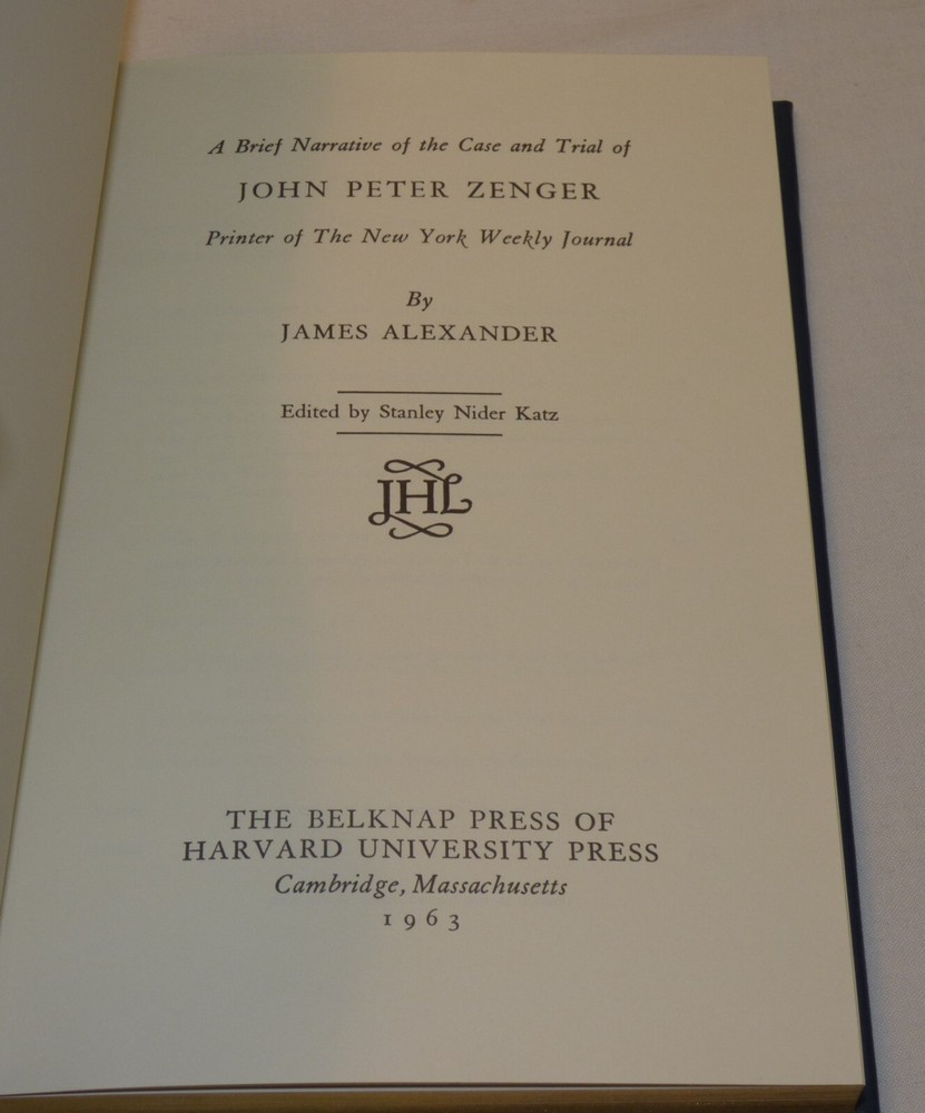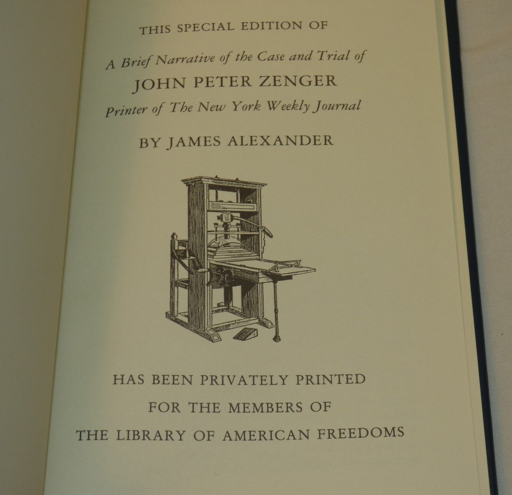 This is "...the Case and Trial of John Peter Zenger Printer of the New York Weekly Journal" by James Alexander which was originally published in 1963. This is a special edition, privately printed for the members of the Library of American Freedoms. Leatherbound hardcover book with gilt edges and marbled endpapers. Published by Palladium Press, 2001. Contains 238 pages. NOTE: please see our other listings for many more books from The Library of American Freedoms - we combine shipping. Very good condition - little to no wear; see all 10 pics Items can be picked up in person at our office. Our home is smoke free. Wir sprechen Deutsch Nice addition to your collection! Please see our other listings. International buyers: customs/duty charges are buyer's responsibility and are not included in shipping cost! We will not falsify US customs documents.
