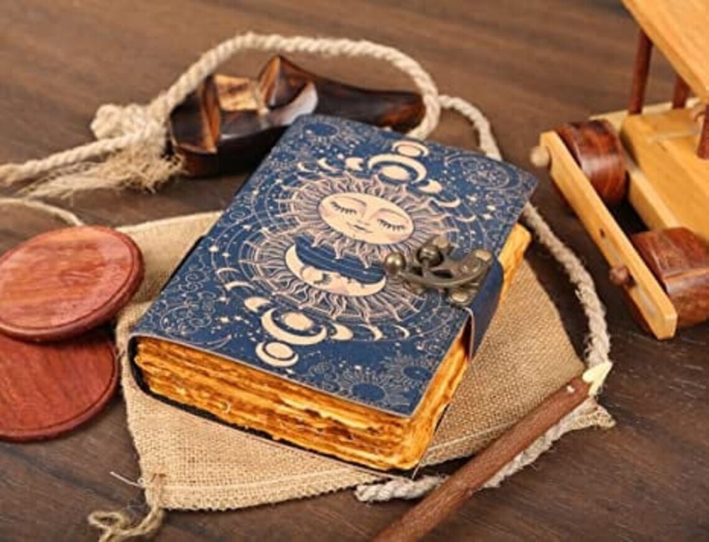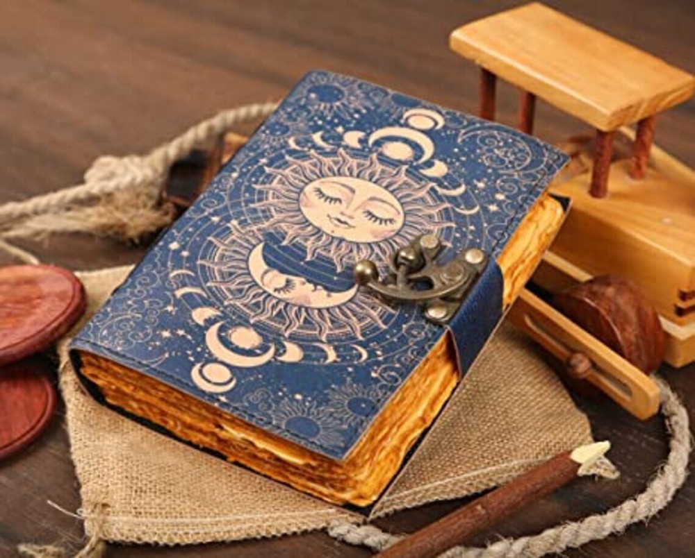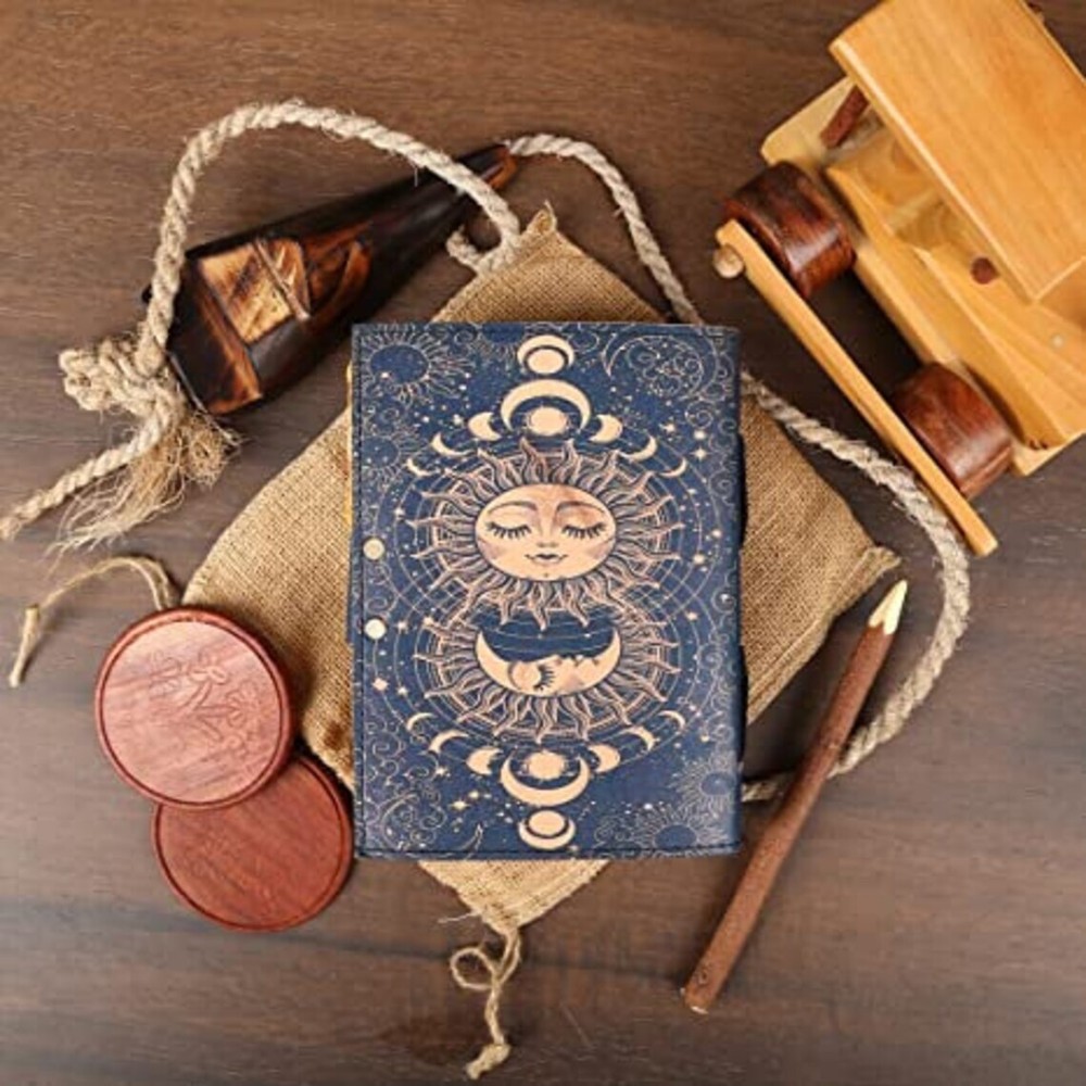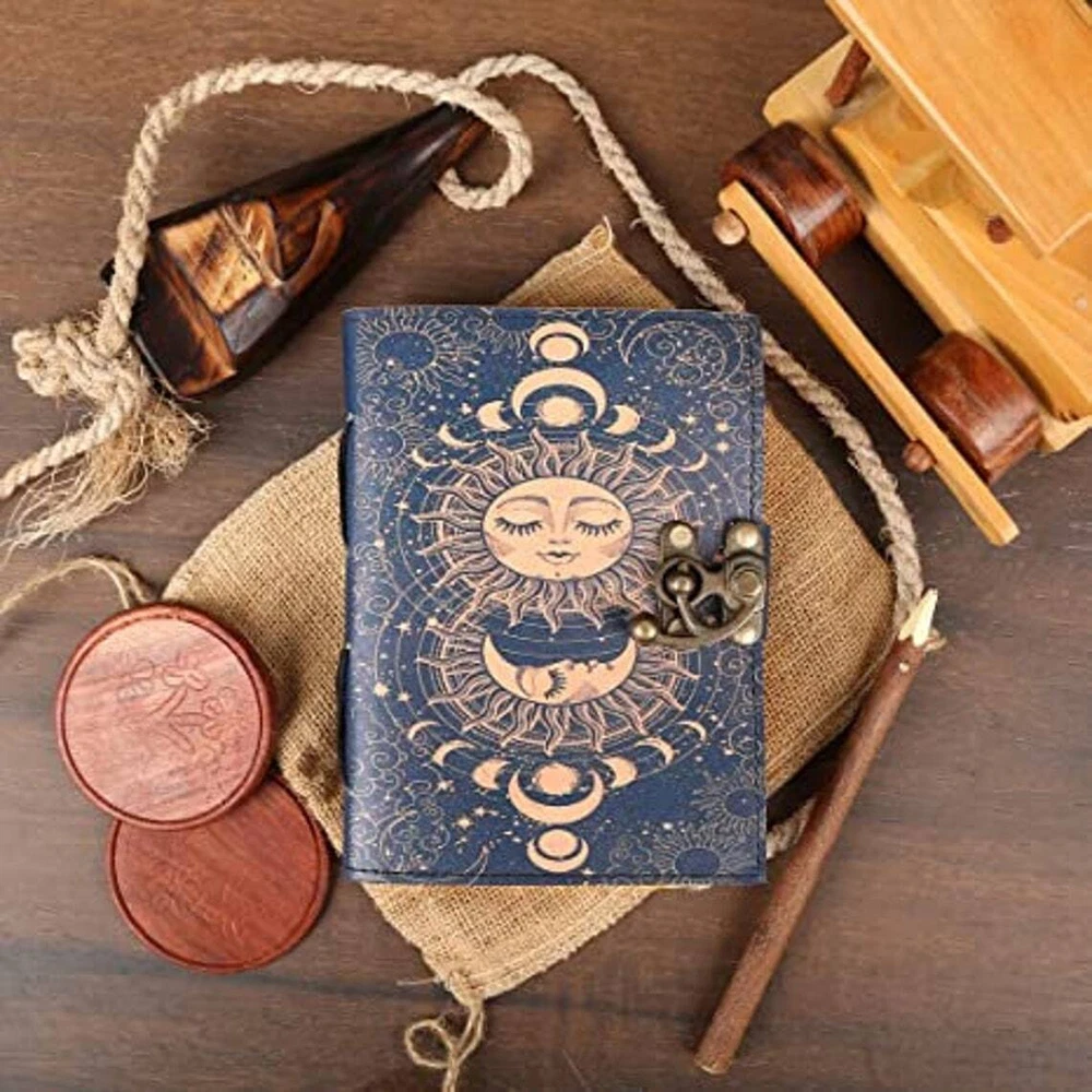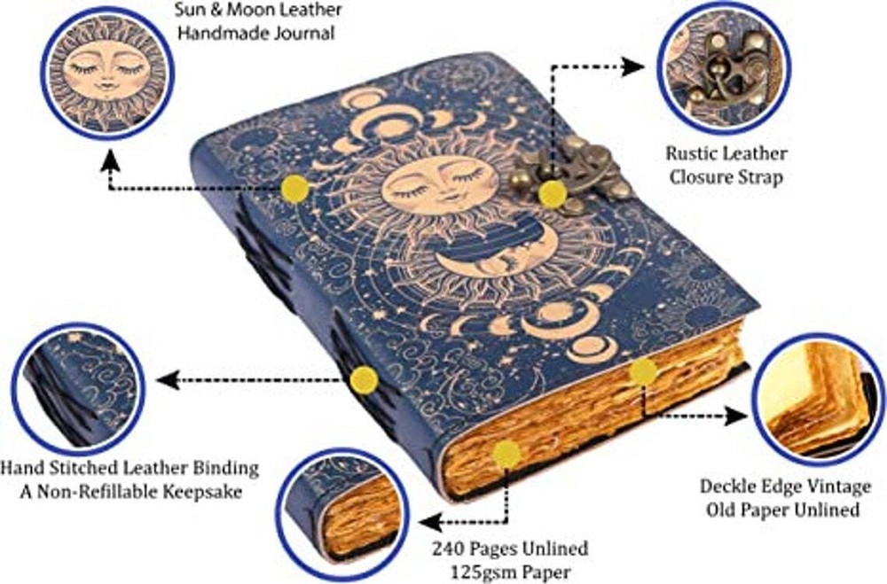 Print - Sun & Moon • vintage lock closer • Thick Genuine Leather • vintage deckle edge old paper • handmade rustic cotton paper • 100 Sheet (200 pages both side) ● Antique Paper - Vintage Journal is made of unique vintage paper which looks like it was pulled from history. You will love the old looking handmade cotton paper (200 pages) which is unique to our vintage journals. ● Sturdy Binding, Leather Wraparound - Sturdy hand stitched binding to make sure that no paper comes out loose. ● Use Any Kind Of Pen - Sketch, Doodle, Write on your journal notebook with a Calligraphy Pen Fountain Pen, Brush Pen, Ball Pen, Acrylic Colours, Watercolor and many more. ◆ {Multiple Uses} ● The vintage leather journal is a perfect sketchbook, drawing journal, great gift for man & woman, book of shadows, grimoire journal , wicca journal , calligraphy journal, story writing, scrapbook, art journal, leather sketchbook, travel journal, journals for women and many more.