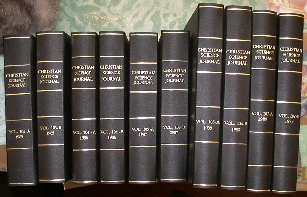 Included in this lot of volumes of The Christian Science Journal are: Vol. 103-A - 1985 Vol. 103-B - 1985 Vol. 104-A - 1986 Vol. 104-B - 1986 Vol. 105-A - 1987 Vol. 105-B - 1987 Vol. 106-A - 1988 Vol. 106-B - 1988 Vol. 107-A - 1989 Vol. 107-B -1989 Note: Beginning in 1988, the Journal switched over from a smaller to larger format, so the last four volumes are larger in size. See our other auctions for more Christian Science periodicals!