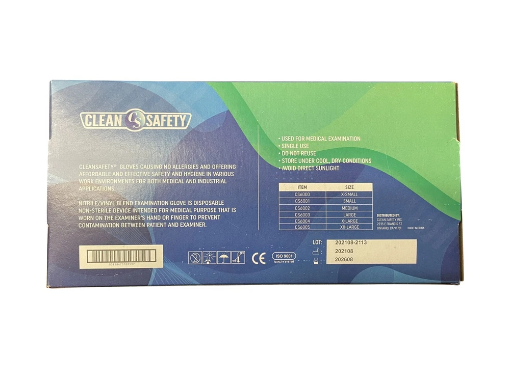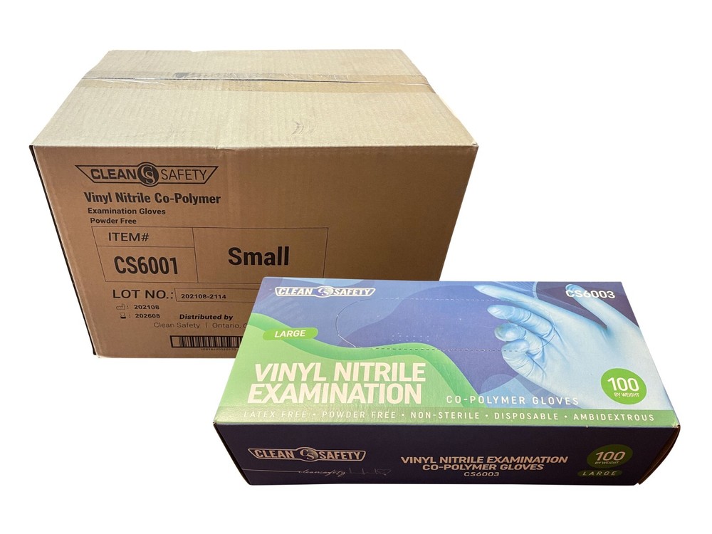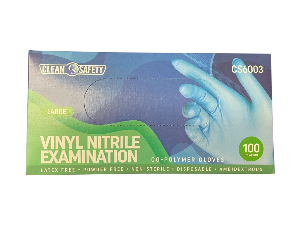 Clean Safety CS6003 Vinyl Co-Polymer Powder Free Gloves Comes in 4 different sizes: Small, Medium, Large & Extra Large. VINYL CO-POLYMER POWDER FREE EXAM GLOVES Vinyl/Nitrile Blend examination gloves Blue color Sold as case of 10 boxes. (1000 gloves) Disposable Non-Sterile