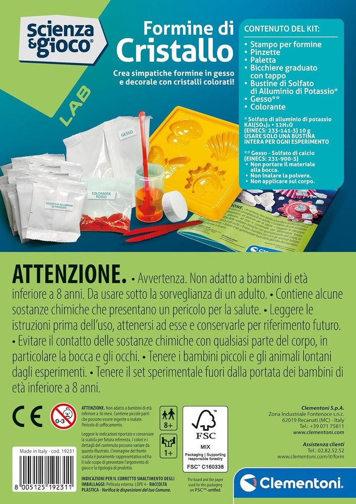 Further Details Title: Clementoni Lab-Formine Set, Laboratorio Cristalli, Experiments Science, Geology, Mineralogy, Scientific Game 8 Years, in Italian, Made in Italy, Multicoloured, 19231 Condition: New Description: PRODUCT DESCRIPTION A little mineral lover at home? Here is a science game "Science and Game Lab" in pocket format with everything you need that allows you to create wonderful crystals... to amaze yourself, in complete safety, with the chemical reactions of the salts. GAME CONTENTS: Laboratory tools, chalk powder, salt reaction ingredient sachets, dyes, mold to create cute plaster molds and manual. A stencil to reproduce different shaped chalks to decorate and embellish with lots of coloured crystals. It will be fun to witness the chemical reaction of salts on the chalk wall. The booklet guides your child step by step in carrying out the experiments. In the rich scientific manual illustrated you will also discover all the secrets of crystal formation and chemical reactions of salts! A scientific laboratory "Science and Game Lab" to bring children closer to crystal science. Recommended for ages 8 and up. Made in Italy SAFETY WARNING No Warning Needed Item Height: 210mm Brand: Clementoni Color: Multi-coloured Dimensions: 15 x 5.5 x 21 cm; 600 g Theme: Geology Material: Plastic Type: Science Kits MPN: 19231 Item Weight: 600g Language: Italian Item Length: 150mm Item Width: 55mm SCIENTIFIC MANUAL: The booklet guides the child step by step in carrying out the experiments. In the rich scientific manual illustrated you will also discover all the secrets of crystal formation and chemical reactions of salts! CRYSTALS LABORATORY: A scientific game with pocket format that allows you to create wonderful bright and colored crystals... to amaze yourself, in complete safety, with the chemical reactions of the salts. Plaster mould: A stencil to reproduce chalks with different shapes to decorate and embellish with many coloured crystals. It will be fun to witness the chemical reaction of salts on the chalk wall. FEATURES: A scientific laboratory "Science and Game Lab" to bring children closer to crystal science. Recommended for ages 8 and up. Made in Italy GAME CONTENT: Laboratory tools, chalk powder, salt reaction ingredient sachets, dyes, mold to create cute plaster molds and manual Missing Information? Please contact us if any details are missing and where possible we will add the information to our listing.