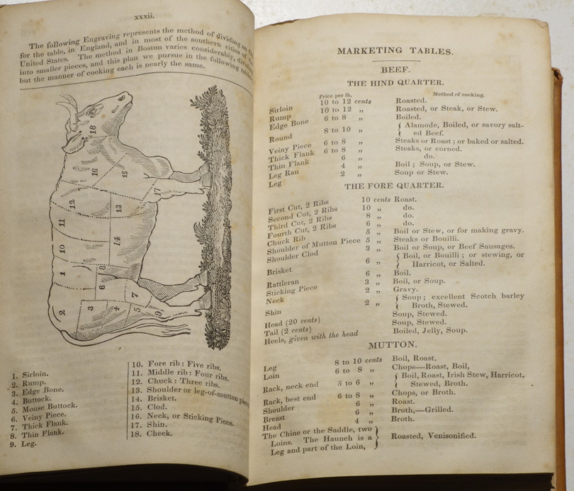 A Boston Housekeeper [Mrs. N.K.M. Lee]. The Cook's Own Book: Being a Complete Culinary Encyclopedia, Boston: Munroe & Francis, 1832. 12mo, first edition, pp. xxxvi, 300, full sheep, probably a 20th-century binding, gilt stamped lettering and rules to spine, with added endpages, reverse of ffep preserving a gift inscription, with another ownership signature on title page. Woodcut engraving showing how to break down an ox. See Axford, p. 99; Wheaton and Kelly 3537; Lowenstein, American Cookery, 160, and Cagle & Stafford 447. OCLC Worldcat locates several copies in American institutions, but this first edition is scarce in the private marketplace, the auction records showing that the last sale took place in 2008 ($1800 at Swann gallery). Condition of this book Very good and tight, boards worn at extremities, scattered light to moderate foxing.