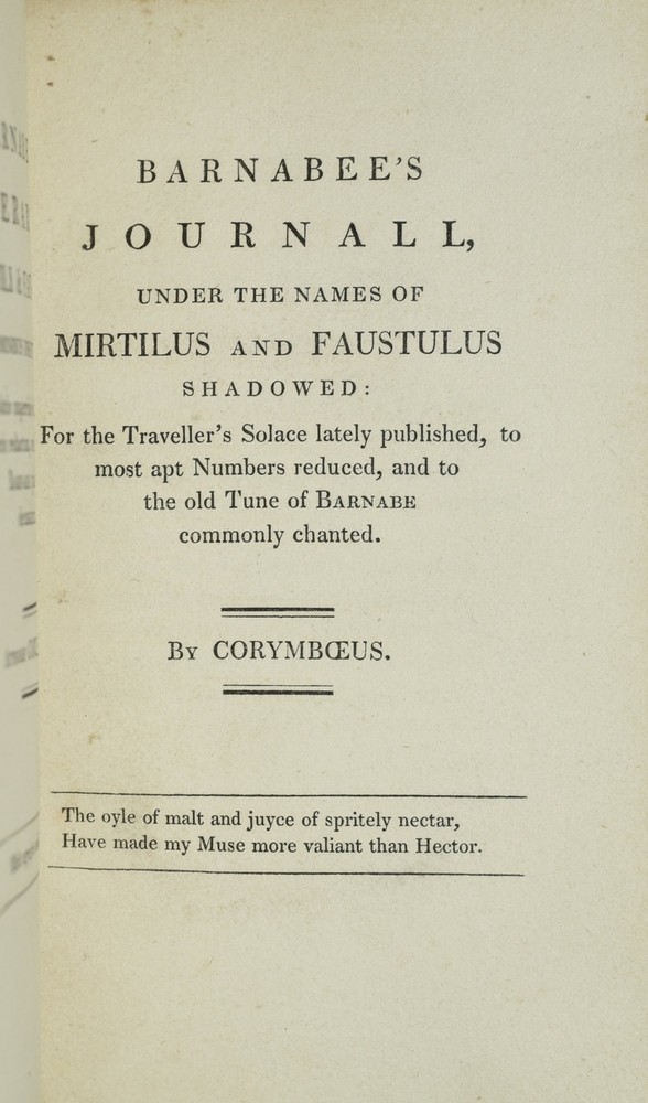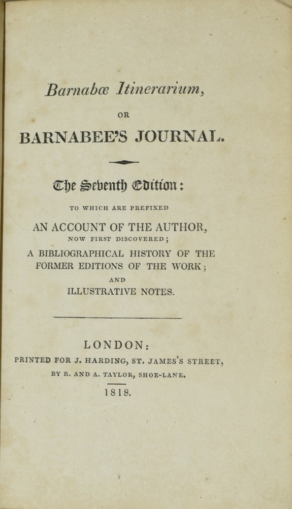 BARNABAE ITINERARIUM, OR BARNABEE'S JOURNAL. THE SEVENTH EDITION: TO WHICH ARE PREFIXED AN ACCOUNT OF THE AUTHOR, NOW FIRST DISCOVERED; A BIBLIOGRAPHICAL HISTORY OF THE FORMER EDITIONS OF THE WORK; AND ILLUSTRATIVE NOTES. | BARNABEE'S JOURNALL, UNDER THE NAMES OF MIRTILUS AND FAUSTULUS SHADOWED. BARNABAE ITINERARIUM, MIRTILI & FAUSTULI NOMINIBUS INSIGNITUM. (TWO VOLUMES IN ONE) Author: Corymbaeus [Richard Brathwait] | [Joseph Haslewood] (Editor) Title: BARNABAE ITINERARIUM, OR BARNABEE'S JOURNAL. THE SEVENTH EDITION: TO WHICH ARE PREFIXED AN ACCOUNT OF THE AUTHOR, NOW FIRST DISCOVERED; A BIBLIOGRAPHICAL HISTORY OF THE FORMER EDITIONS OF THE WORK; AND ILLUSTRATIVE NOTES. | BARNABEE'S JOURNALL, UNDER THE NAMES OF MIRTILUS AND FAUSTULUS SHADOWED. BARNABAE ITINERARIUM, MIRTILI & FAUSTULI NOMINIBUS INSIGNITUM. (TWO VOLUMES IN ONE) Publication: London: Printed for J. Harding by R. and A. Taylor, 1818 Description: Half Leather. Two volumes bound together. The first volume being the bibliographical and textual history and criticism by the editor, Joseph Haslewood. Second volume is the "fac-simile edition of the first impression of the Itinerary" (p. 142), published concurrently. The most famous of Brathwaite's works (his family name changed spellings like the weather), Barnabee's Journal was published under the pseudonym Corymbaeus, and it wasn't until this edition that the authorship was ascertained. "A sprightly record of English travel, in Latin and English doggerel verse... Southey pronounced the original the best piece of rhymed Latin in modern literature." (DNB II, 1142). The Seventh Edition of the Itinerarium, the first Haslewood edition, bound together with the publisher's facsimile of the First Issue; collation and pagination reset. Contemporary binding; endpapers watermarked "A 1825." Armorial bookplate; blindstamp on front flyleaf. Additional title page, engraved. Seven additional engraved plates. Collates complete; 141, [1], 204, [2] pp., final leaf blank. Half leather over marbled paper boards. Some wear to the joints, very slight foxing to the plates, some rubbing to the marbled paper boards. All edges marbled. Silk ribbon marker bound in. Very Good binding. Seller ID: 285749 Subject: Books on Books, History & Military, Literature and Genre Black Swan Books Richmond VA We specialize in antiquarian books, classic literature, the Civil War, Viriginiana, travel, art, children's books, and other subject areas, including religion and philosophy . Terms Payment via PayPal is preferred. All orders ship within two [2] business days, Monday through Friday by standard mail, USPS Media Mail. Combined orders and expedited shipping is available. Please contact us for a shipping quote before ordering. All items are guaranteed as listed and described. Any item may be returned within 30 days for any reason in the condition is which they were sent. This listing was created by Bibliopolis.