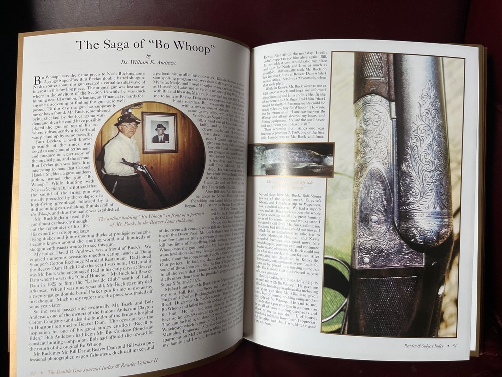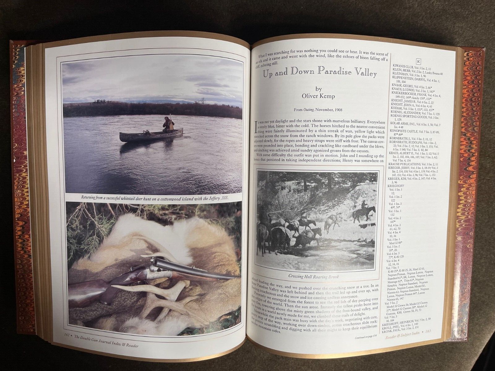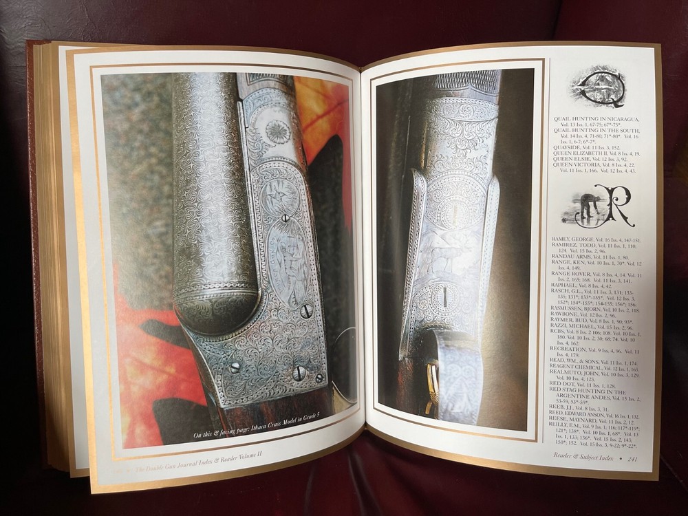 The Double Gun Journal Index & Reader - -Volume 2, 343 Pages, provides research to the more than 300 articles appearing in the eight years of DGJ publication (1997 thru 2005). Search any proper noun or subject matter we have published in those 32 issues. In addition, this leather hardbound book contains 67 new never-before published articles ( 279 pages in all) written by the Double Gun Journal authors who contributed to our journal during those eight years (1997-2005). Plus 100 pages of rare vintage articles you will enjoy. ***** Unlike Index & Reader Vol. 1, I have a good supply of this Index & Reader Vol. 2 remaining-- all are in mint/unopened condition. DGJ Index & Readers 1 & 2 Are The Perfect Companions Providing Access To The Double Gun Journals You Have Collected Throughout The Years ! Index & Reader Volume 3 Is now available -- see Ebay listing to order and add this 456 page book to your library ! I will be happy to inscribe and sign this book for you-- Let me know what you prefer via ... " CONTACT SELLER " (above right) Daniel & Joanna Côté DGJ Publishers Since 1989 TO SEE OUR OTHER DOUBLE GUN JOURNAL PRODUCTS>>> Click On : "See Other Products" (Above Right)