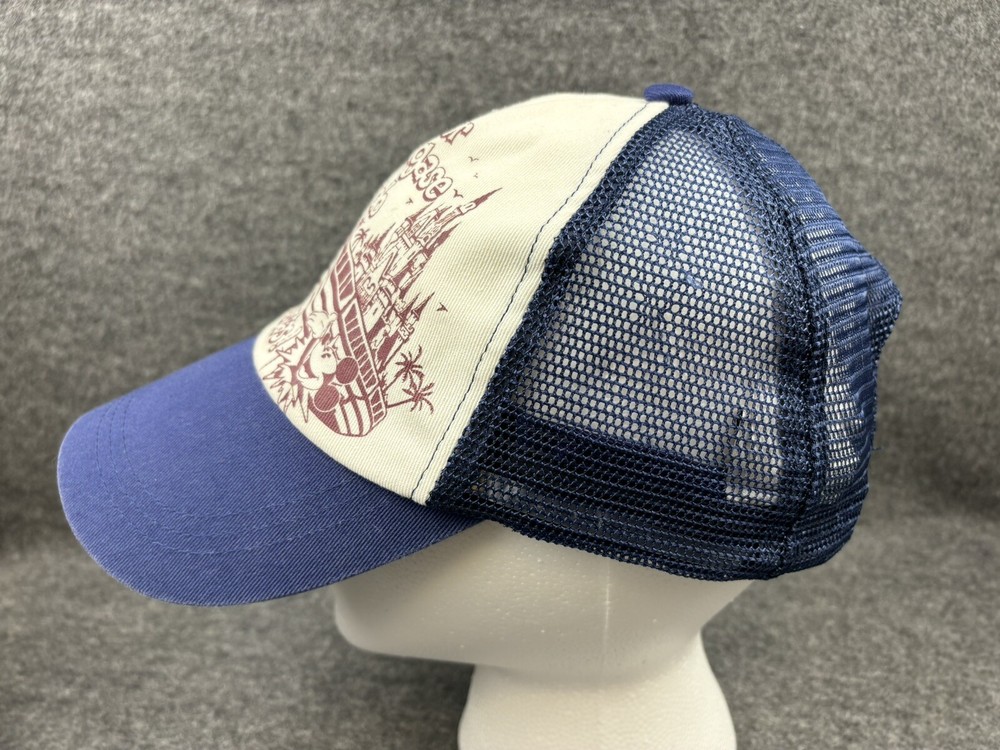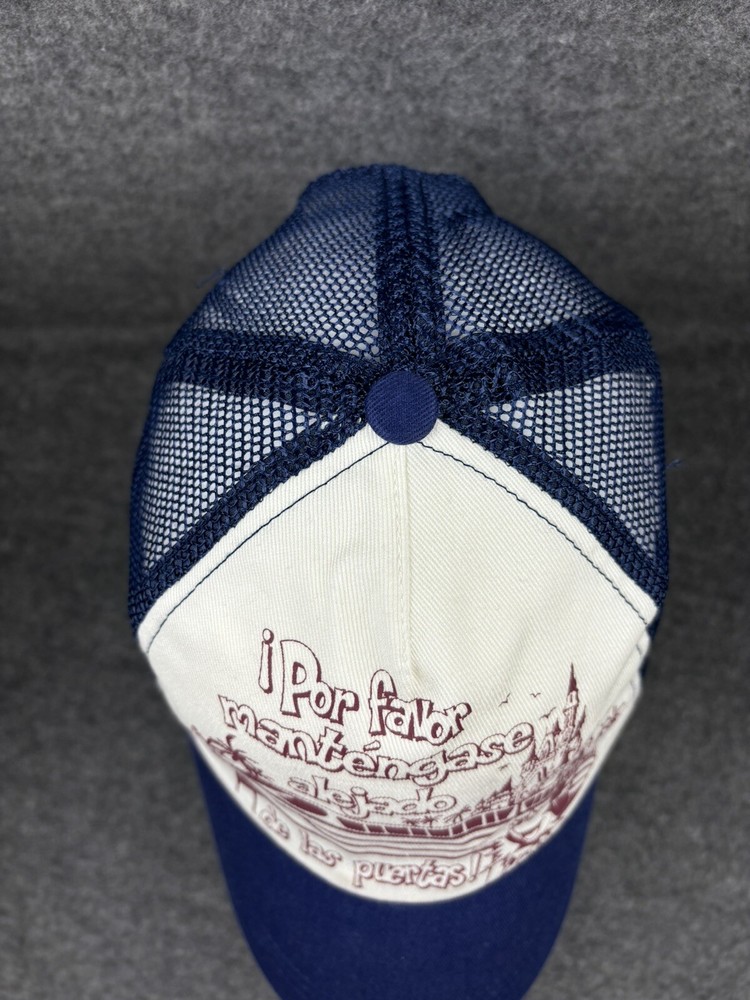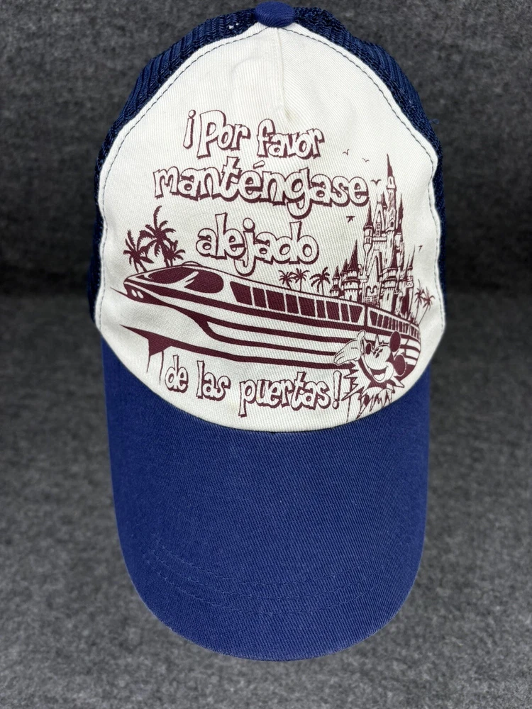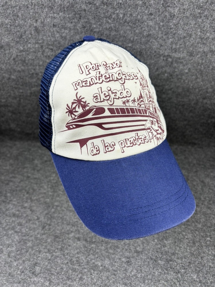 DISNEY PARKS AUTHENTIC MONORAIL MESH BASEBALL CAP ADULT SIZE “POR FAVOR MANTENGASE ALEJADO DE LAS PUERTAS!” LISTING IS FOR ONE PRE-OWNED MESH SNAP BACK ADJUSTABLE DISNEY PARKS MONORAIL BASEBALL CAP IN EXCELLENT CONDITION. NAVY BLUE AND CREAM COLOR AND MAROON DESIGN. HAT IS VERY CLEAN ALMOST LIKE NEW. A LITTLE FADE MARK ON THE INSIDE RIM. THERE A COUPLE SNAGS IN THE MESH ON THE INSIDE. NO HOLES DESIGN IS: “POR FAVOR MANTENGASE ALEJADO DE LAS PUERTAS! MICKEY MOUSE, CASTLE AND MONORAIL. YOU WILL RECEIVE EXACT ITEM SHOWN IN PICTURES PLEASE SEE “ALL” PHOTOS FOR DETAILS, CONDITION AND MEASUREMENTS. ALL ITEMS SOLD AS IS. GENERAL INFO: *I ONLY CHARGE ACTUAL SHIPPING BY WEIGHT AND YOUR ZIP CODE THROUGH USPS. NO EXTRA HANDLING FEES *I WILL COMBINE SHIPPING. PLEASE WAIT UNTIL I SEND AN INVOICE WITH THE TOTAL OF ALL THE ITEMS. *IF YOU HAVE ANY QUESTIONS, PLEASE FEEL FREE TO MESSAGE ME. THANK YOU FOR STOPPING BY. HOPEFULLY YOU'LL HAVE A CHANCE TO LOOK AT MY OTHER LISTINGS