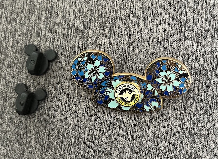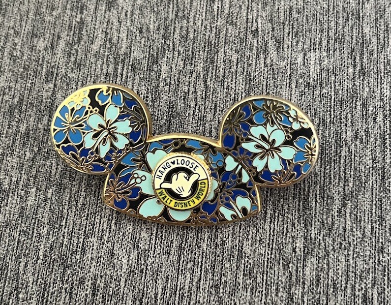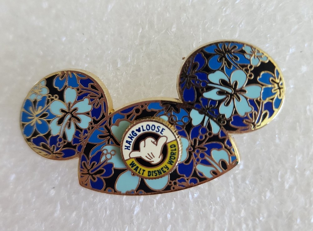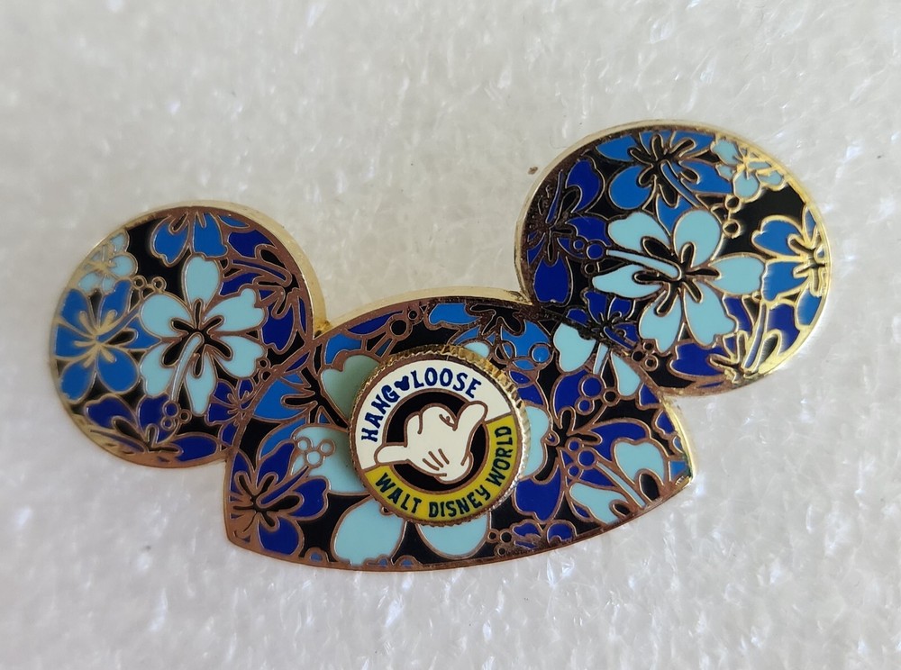 This beautiful Mickey Mouse Ear Hat pin is decorated with hibiscus flowers. The Open Edition pin features a round pin-on-pin with Mickey's hand and says "Hang Loose Walt Disney World" in various shades of yellow. Flowers are 3 shades of blue. Back stamped: 2006 Official Pin Trading Logo...(C)Disney...Made in China. Approx. size: 1" T x 1 3/4" W A must have for any Mickey Mouse ear hat and/or Disney pin collectors. Don't miss out on this chance to own a fabulous piece of Disney memorabilia. Shipping in the US is FREE! Overseas shipping is $18.00 Please e-mail me with any questions before bidding. Check out my other eBay auctions for more great items. Thanks and Good Luck!! I accept payments from anyone with a credit card at PayPal - always FREE !