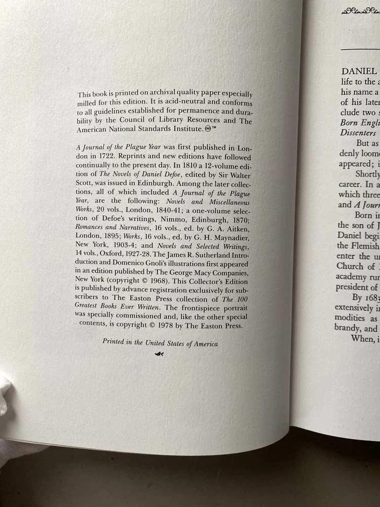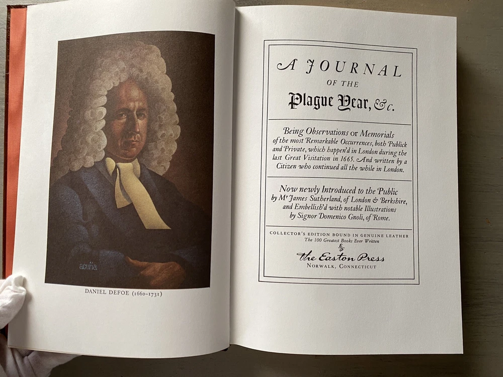 Title: A Journal of The Plague Year by Daniel Defoe - 1 st Collector’s Edition & 1 st printing of The 100 Greatest Books Ever Written (see photo) Collector’s Edition Bound in genuine Leather Bound, The Easton Press – Norwalk, Connecticut, Printed in the United States of America - On the inside page it states: “This Collectors Edition is published by advance reservation exclusively subscribers to the Easton Press collection of The 100 Greatest Books Ever Written. The frontispiece portrait was specially commissioned for this edition and, like the other special contents, is copyright ©1978 by The Easton Press.” Condition: - Like New - Mint- Unread & Unopened - Part of the 100 Greatest Books ever Written Book Club Subscription!! - Only 1 Owner, From a Pet & Smoke FREE home – Books were stored in library - Book is crisp, and clean throughout with no visible wear. - A truly beautiful collectible book. Publication: The Easton Press, Norwalk, Connecticut, ©1978 Edition: 1st Edition, 1st Printing of The 100 Greatest Books Ever Written (see photo) Collector’s Edition Bound in Genuine Leather Bound Binding & Pages: - Features Easton Press distinctive qualities: a genuine, premium leather binding, 22kt gold gilt cover and spine lettering and decoration, specially milled acid-neutral paper, Smyth-sewn pages with gilded edges, and end sheets of moiré silk with a permanent satin ribbon page-marker. - his book has been handled extremely carefully with white gloves and will be very carefully packed. Shipping: Shipping within USA via USPS Media Mail – Very Carefully Packed Notes: - Please review all photographs and message me with any questions. - Thank you for visiting my shop! Have a great day! - Be sure to visit my eBay store for more great books