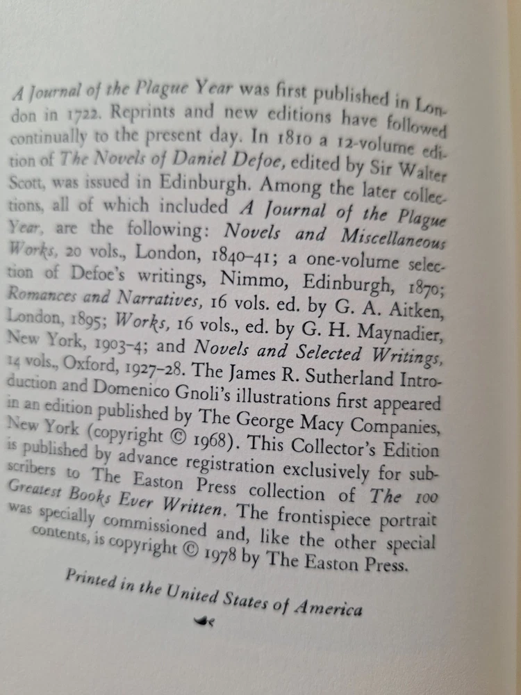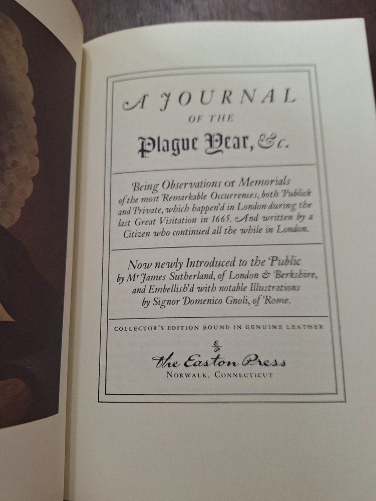 This is a 1978 Easton Press publication of Daniel Defoe's "A Journal of The Plague Year," bound in leather. The book belongs to the topic of Journalism and is a collectible piece for book enthusiasts. With the classic Easton Press design and the renowned author's work, this edition offers a unique and valuable addition to any library focused on historical accounts or literature. Nice condition. No foxing or bookplate.