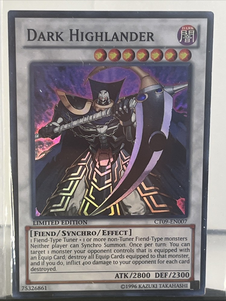 Elevate your Yu-Gi-Oh! TCG collection with the formidable Dark Highlander, card number CT09-EN007. This Super Rare and Limited Edition card from the 2012 Collectors Tin is a must-have for enthusiasts and competitive players alike, featuring the Fiend creature type and a devastating 2800 attack power coupled with a robust 2300 defense. Crafted with quality card stock and showcasing a captivating Holo finish, this English-language card has stood the test of time since its manufacture in the United States. Though not autographed, its rarity and the prestige of being a part of the 2012 Anime Expo event make it a valuable and vintage addition to any collection.