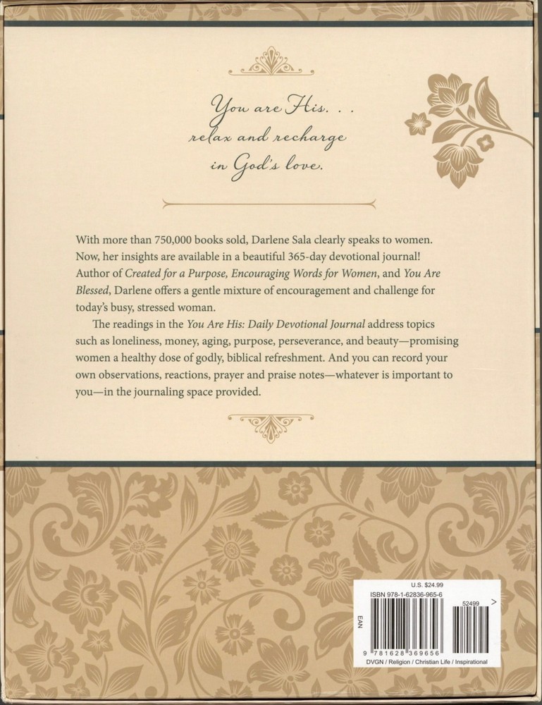 You Are His Daily Devotional Journal: From the Beloved Author of Created for a Purpose and Encouraging Words for Women Author: Darlene Sala Title: You Are His Daily Devotional Journal: From the Beloved Author of Created for a Purpose and Encouraging Words for Women Publication: Shiloh Run Press, 2014 Description: Paperback. New imitation leather softcover daily devotional journal with gilt edges. Comes in a gift box. 8vo. (9½ x 7). 384 pp. Fast shipping in a secure book box mailer with tracking. New. With more than 750,000 books sold, Darlene Sala clearly speaks to women. Now, her insights are available in a beautiful 365-day devotional journal! Author of Created for a Purpose, Encouraging Words for Women, and You Are Blessed, Darlene offers a gentle mixture of encouragement and challenge for today's busy, stressed woman. The readings in this You Are His Daily Devotional Journal address topics such as loneliness, money, aging, purpose, perseverance, and beauty--promising tired women a healthy dose of godly, biblical refreshment. And you can record your own observations, reactions, prayer and praise notes--whatever is important to you--in the journaling space provided. . Seller ID: 2548 Subject: Religion The Anthropologists Closet offers a wide variety of non-fiction academic books that are hard to find. We have been in business since 2014. Terms All orders ship within two business days. All items are guaranteed to be as described or they may be returned within 30 days of receipt for a full refund. This listing was created by Bibliopolis.