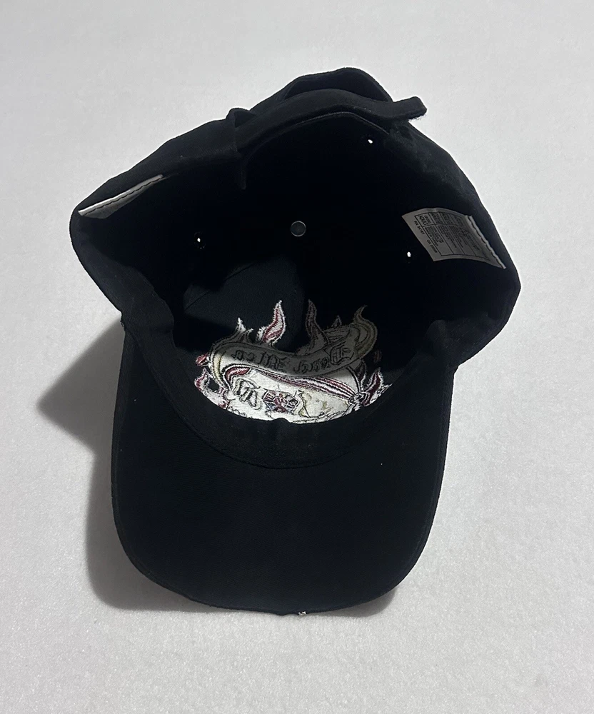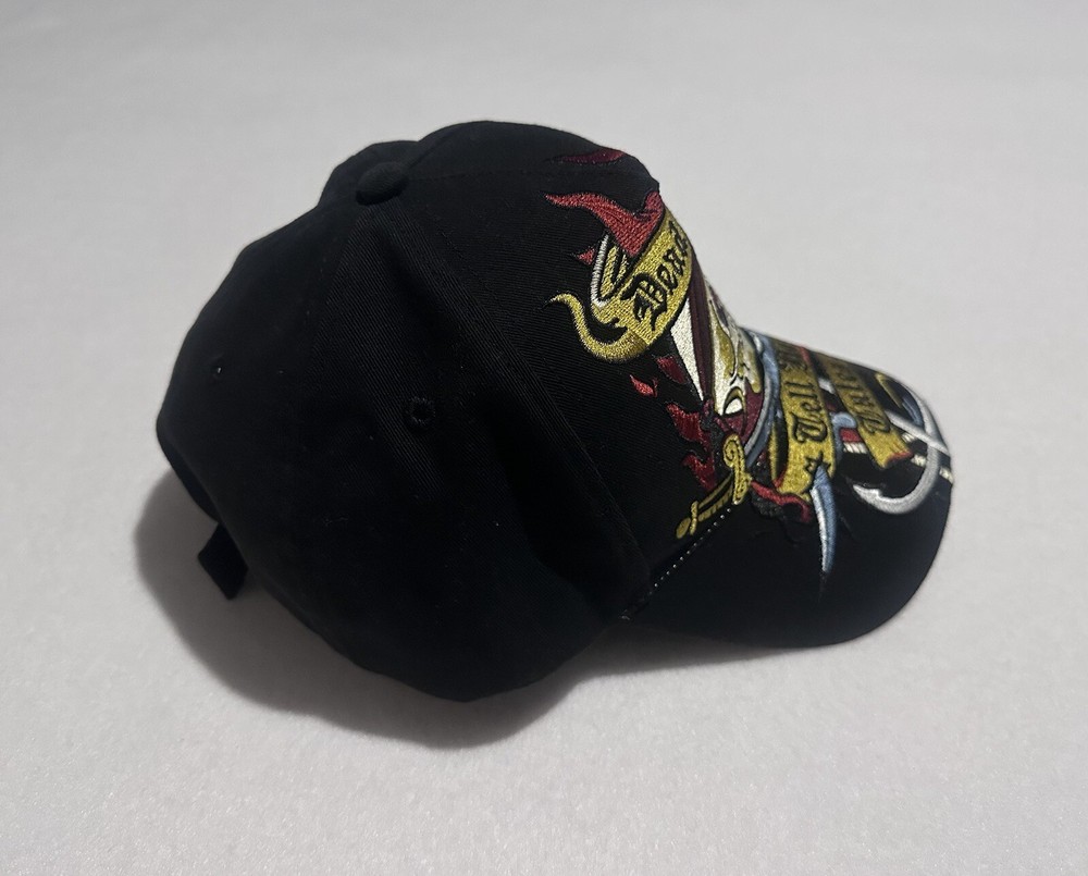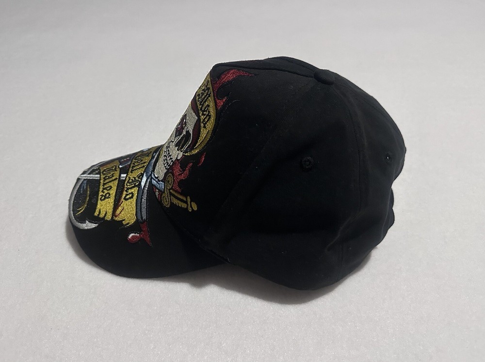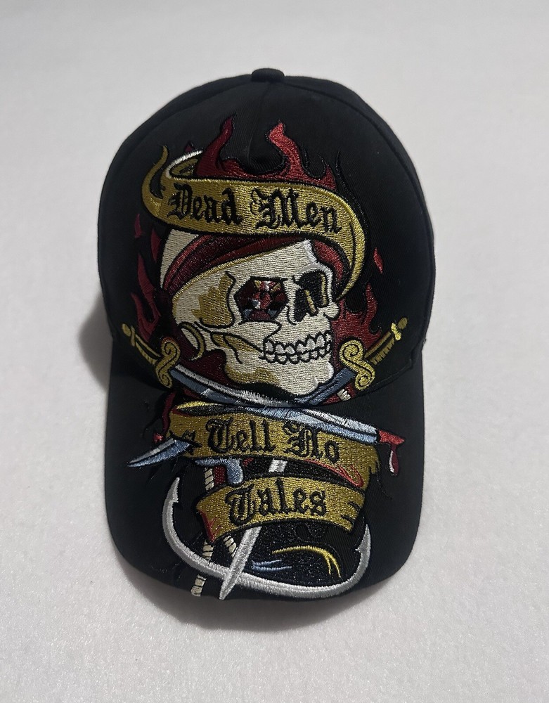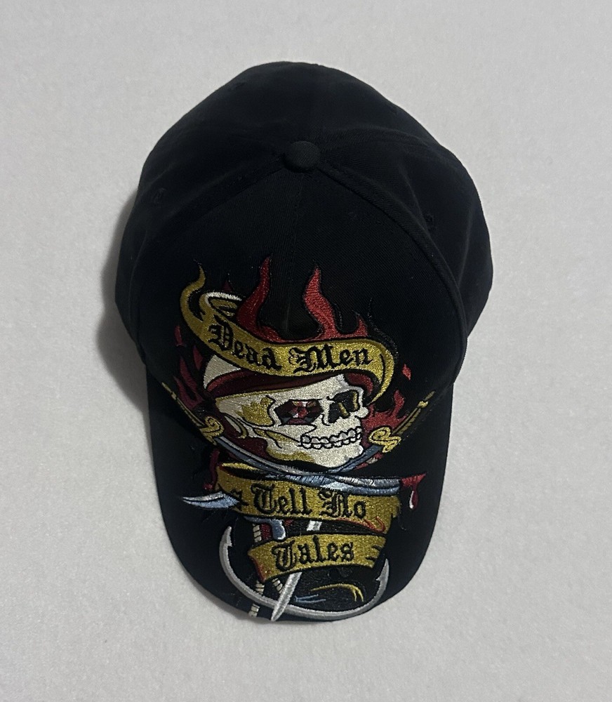 This is a Pirates of the Caribbean-themed baseball hat from Walt Disney World. The hat is black in color and features an adjustable size. It is part of the Disney franchise and suitable for adults. The design is inspired by the movie "Dead Men Tell No Tales" and is unisex. Made in China, this hat is a collectible Disneyland item for fans of the Pirates of the Caribbean movie series.