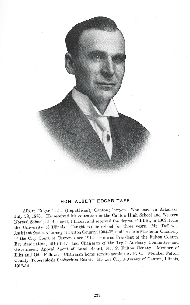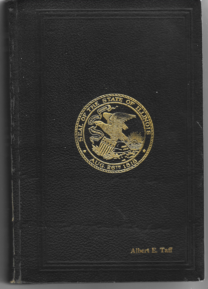 Delegates' Manual of the Fifth Constitutional Convention of the State of Illinois 1920 Including Data Relative to the Calling and Assembling of the Convention, together with a list of Delegates, rules, committees, portraits, biographies and other information concerning the organization and work of the Convention. Edited by B.H. McCann, Secretary, printed by Illinois State Journal Company, Springfield, Illinois, State Printers, 1920. This is a black leather covered hardback book with gold lilt lettering on cover and spine. This book belonged to Albert E. Taff as his name is printed on the cover and his portrait and biography is provided on page 233. The title page shows foxing all other pages are clean and crisp, magazine style paper. The black cover is a bit warped but otherwise very good.