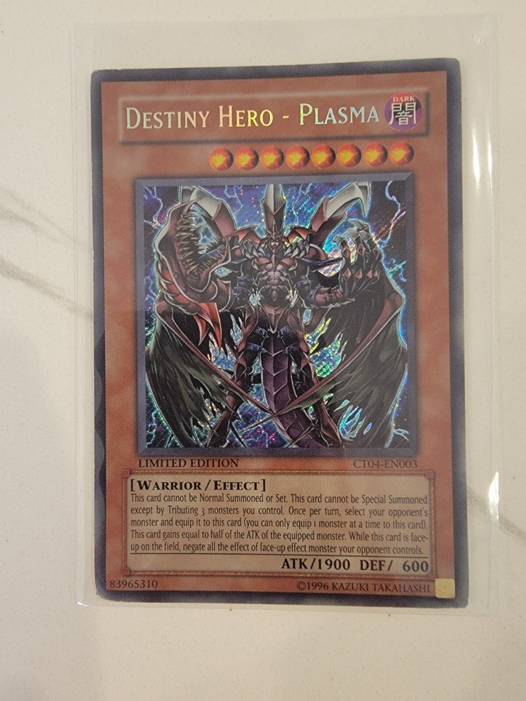 This limited edition card is a must-have for any Yu-Gi-Oh! collector. The Destiny Hero - Plasma card is a secret rare card from the 2007 Collectors Tins set. It features a dark warrior creature type with an effect card type and a holo finish. The card is manufactured by Konami and has the card number CT04-EN003. This card is perfect for those who are looking for a unique addition to their collection. It is a rare find and will make a great addition to any Yu-Gi-Oh! collection. Don't miss out on the opportunity to own this rare card.