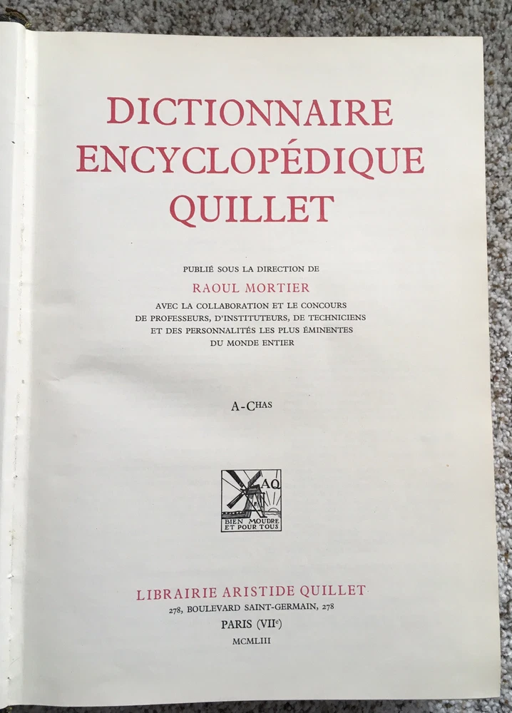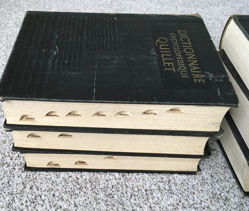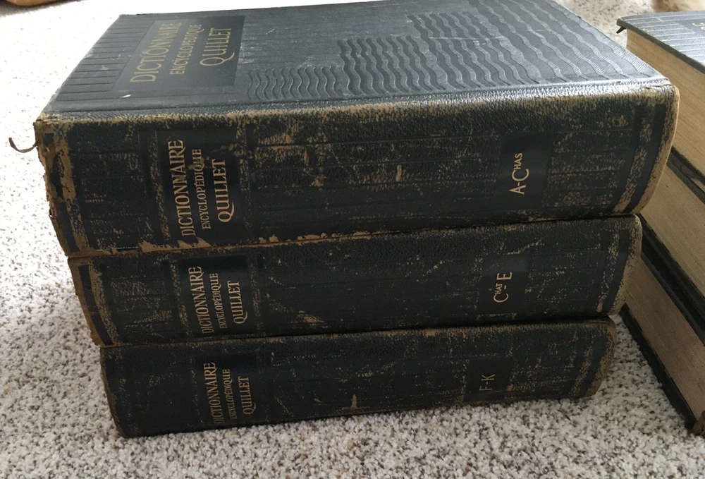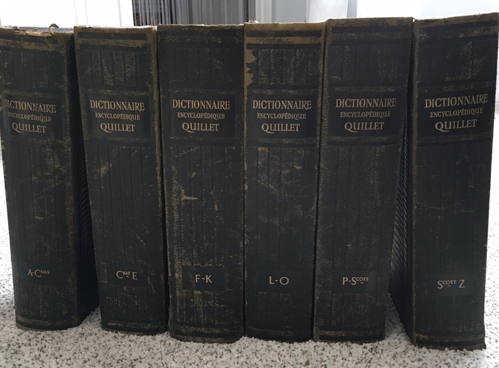 Dictionnaire Encyclopedic Quillet Full IN 6 Volumes - II, III, IV - 1953 A-Z. 6 volumes used encyclopedias in French writing. The pages themselves seem cleaned with no writing nor highlighting noticed. Some occasional tanning. The covers are worn but still very strong, with some marks, tears, scratches, worn leather. Please see photos. The knowledge is heavy ,judging by the weight of this wonderful set.