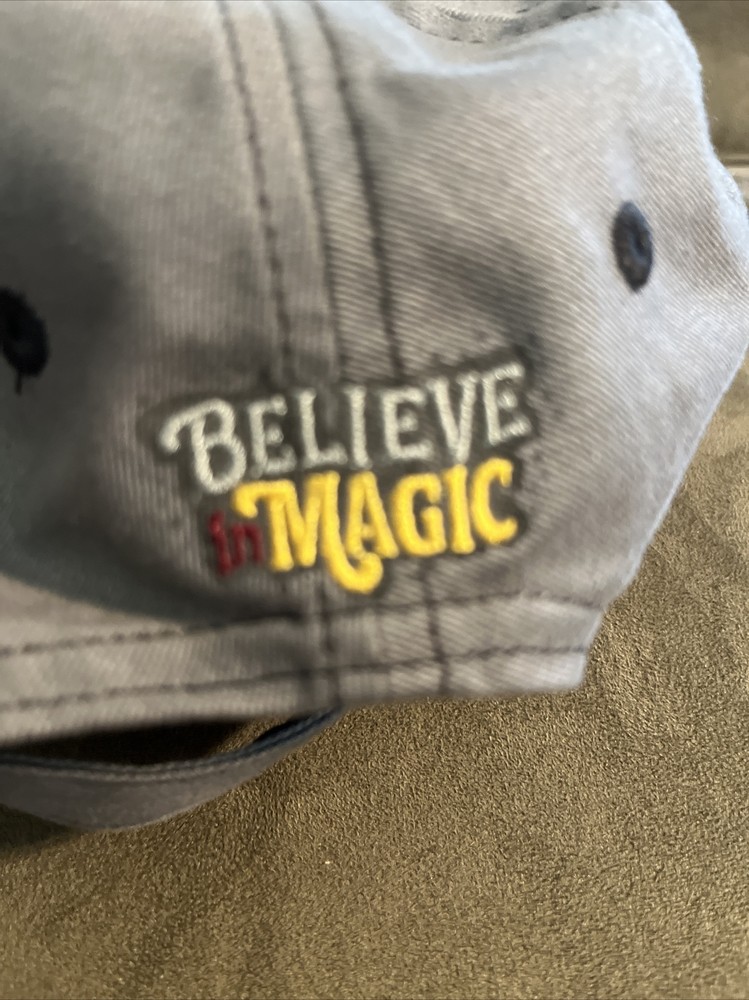 This product is a grey adjustable hat with the embroidered phrase "BELIEVE IN MAGIC" and the Walt Disney World logo. It was manufactured in China in 2013 and is part of the Disney franchise. The hat is a collectible and a contemporary theme park souvenir. Original tags attached. Adult size. This comes from a smoke free, pet free home.