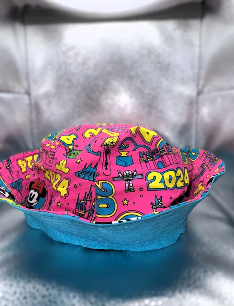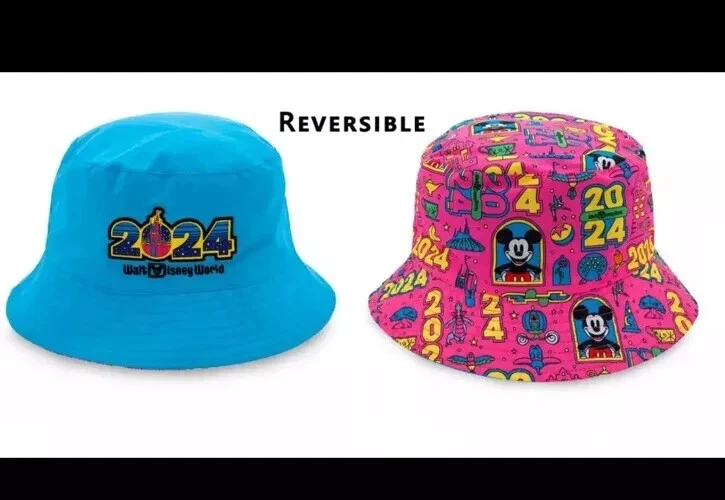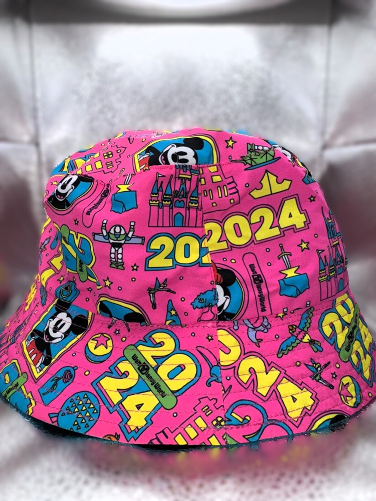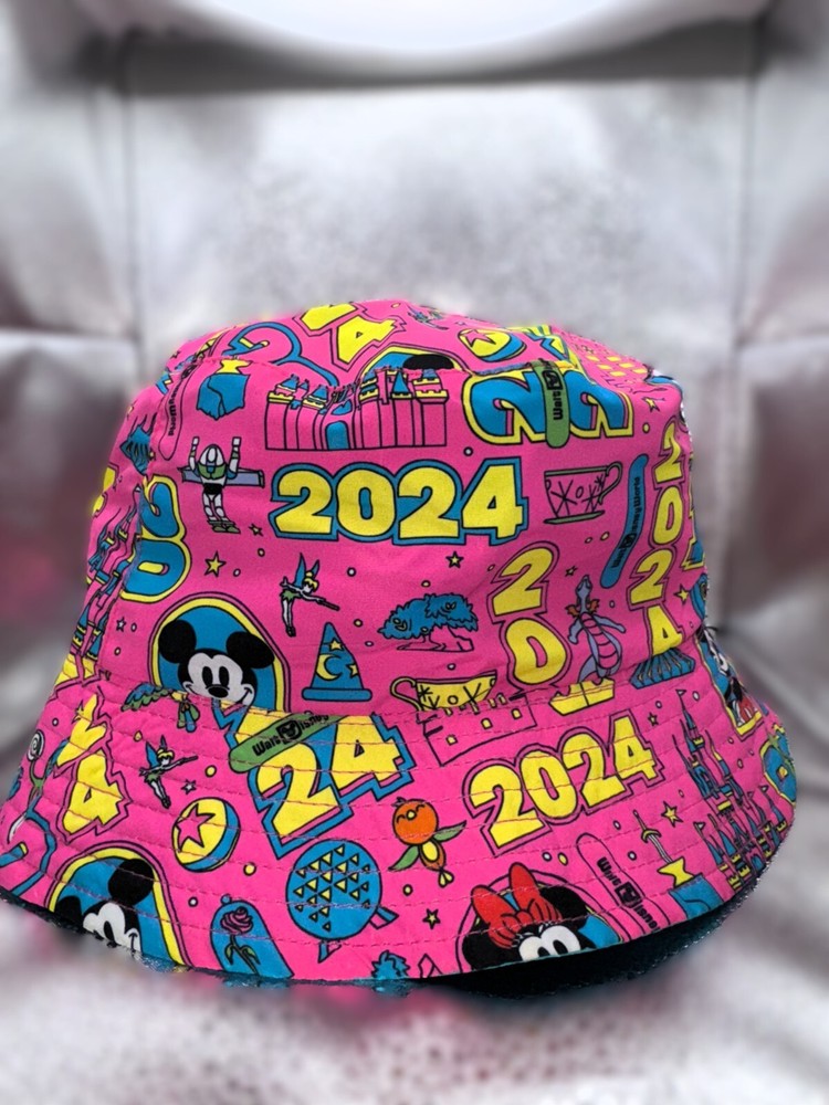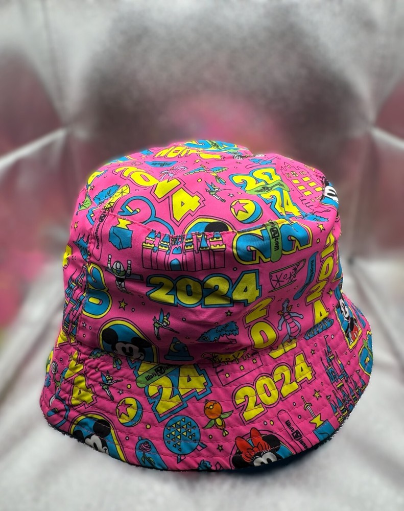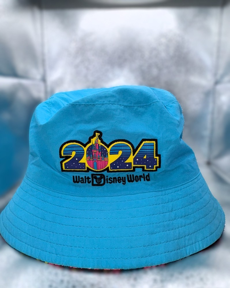 Flash forward to good times at The Most Magical Place on Earth in this floppy bucket hat with embroidered Walt Disney World logo and 2024 text appliqué on top side plus a wild allover dated print pattern on the reverse. Floppy bucket hat Reversible Soft flexible fabric 2024 logo appliqué with print Cinderella Castle and embroidered border Embroidered Walt Disney World Logo Reverse side features 2024 print pattern with Mickey, Minnie, plus Walt Disney World attraction and character icons Stitched brim Part of the Brave New World 2024 Dated Collection One size fits most adults Solid side: nylon, exclusive of decoration Print side: polyester Imported *Authentic Disney Parks Merchandise*