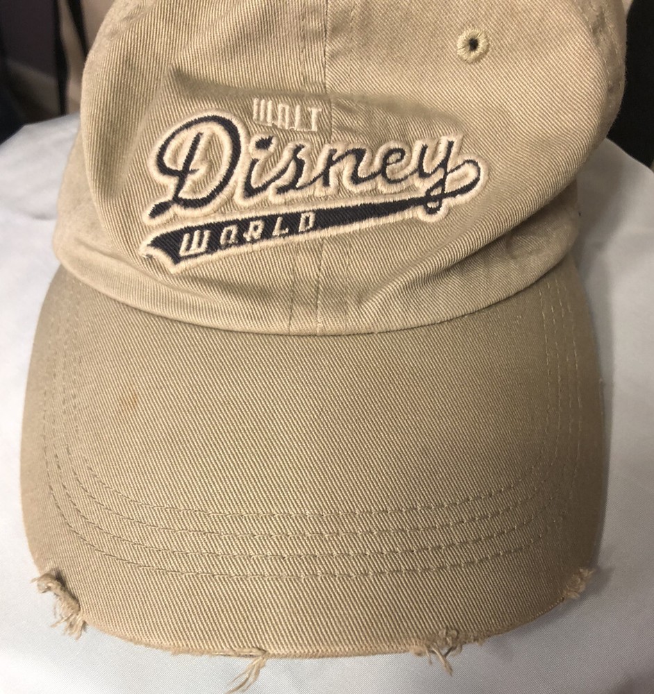 Tattered Bill Disney Cap Hat Walt Disney World Leather Adjustable Back Strap. Green patena on leather strap from closures. Condition is Used. Shipped with USPS First Class.