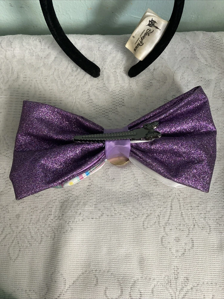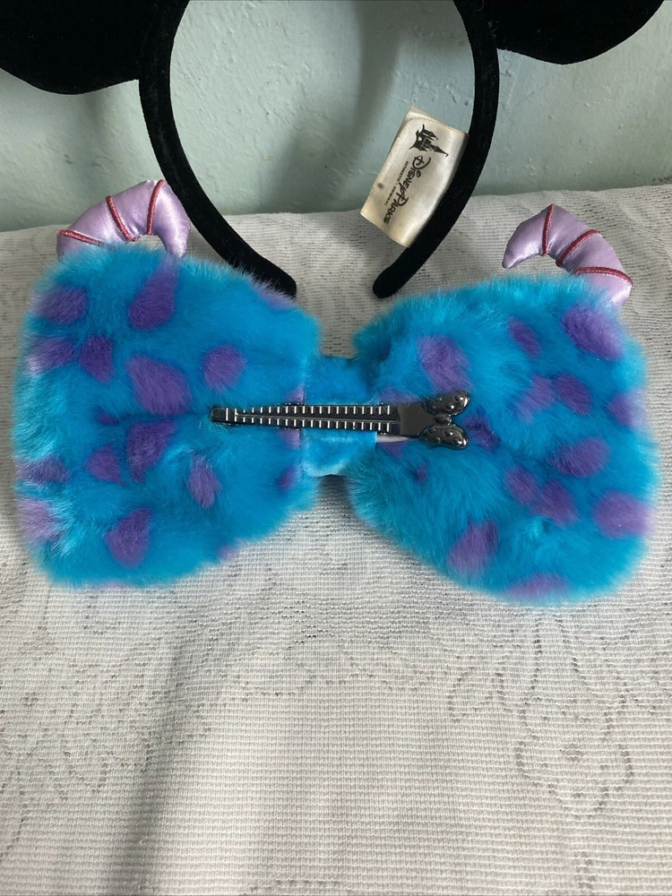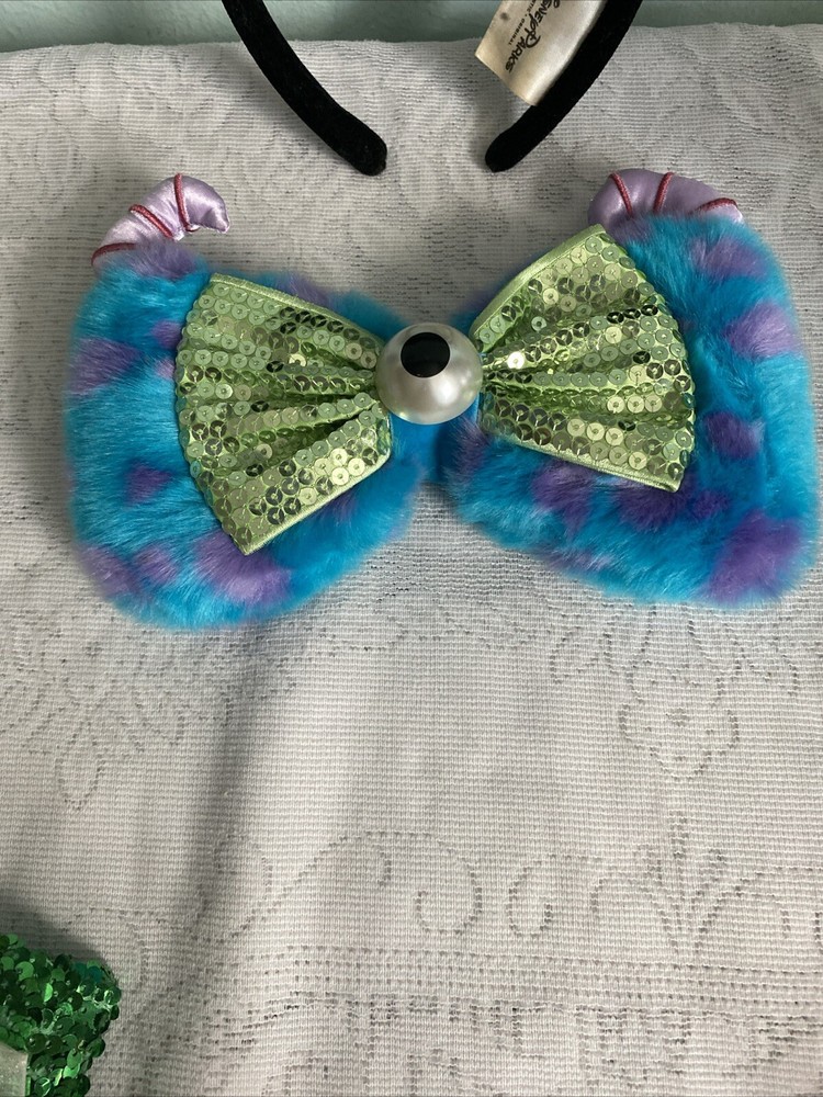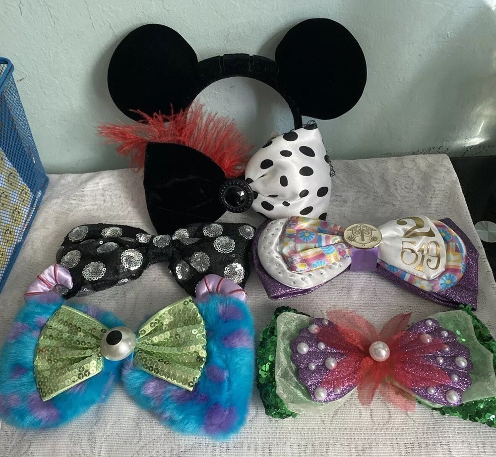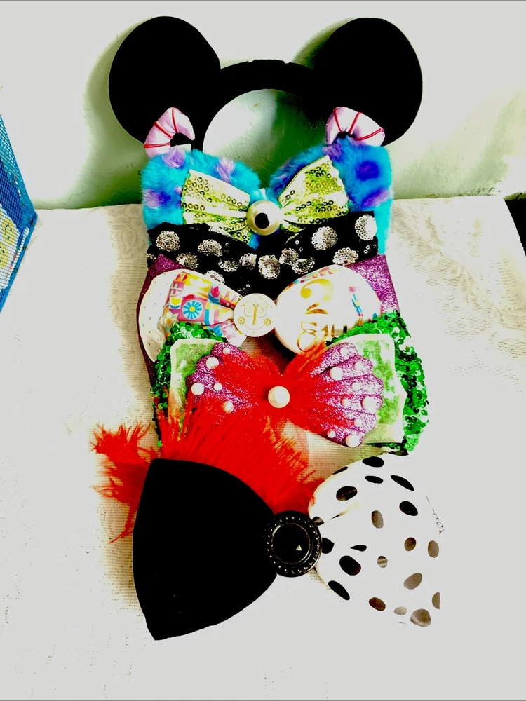 Add a touch of Disney magic to your outfit with this interchangeable bow headband. The headband comes with 5 different bows, featuring the beloved character Minnie Mouse. Perfect for adult Disney fans, this headband is suitable for any occasion, from a day at the park to a casual outing with friends. The multicolor bows add a pop of color to your outfit, while the unisex design makes it a great gift for any Disney lover. Represent your love for the franchise with this stylish accessory, perfect for any Disneyana collection. Lot includes Monsters Sulley/Mike plush sequin bow, Little mermaid Ariel bow, It’s a small world bow, Polka dot Minnie bow and Cruella Da Vil bow.