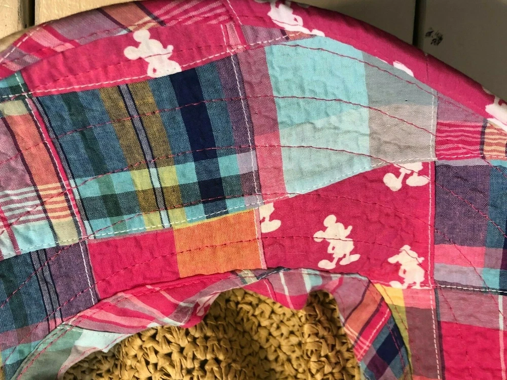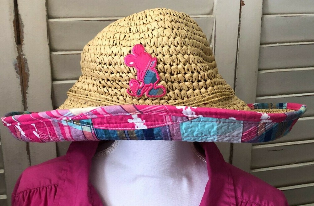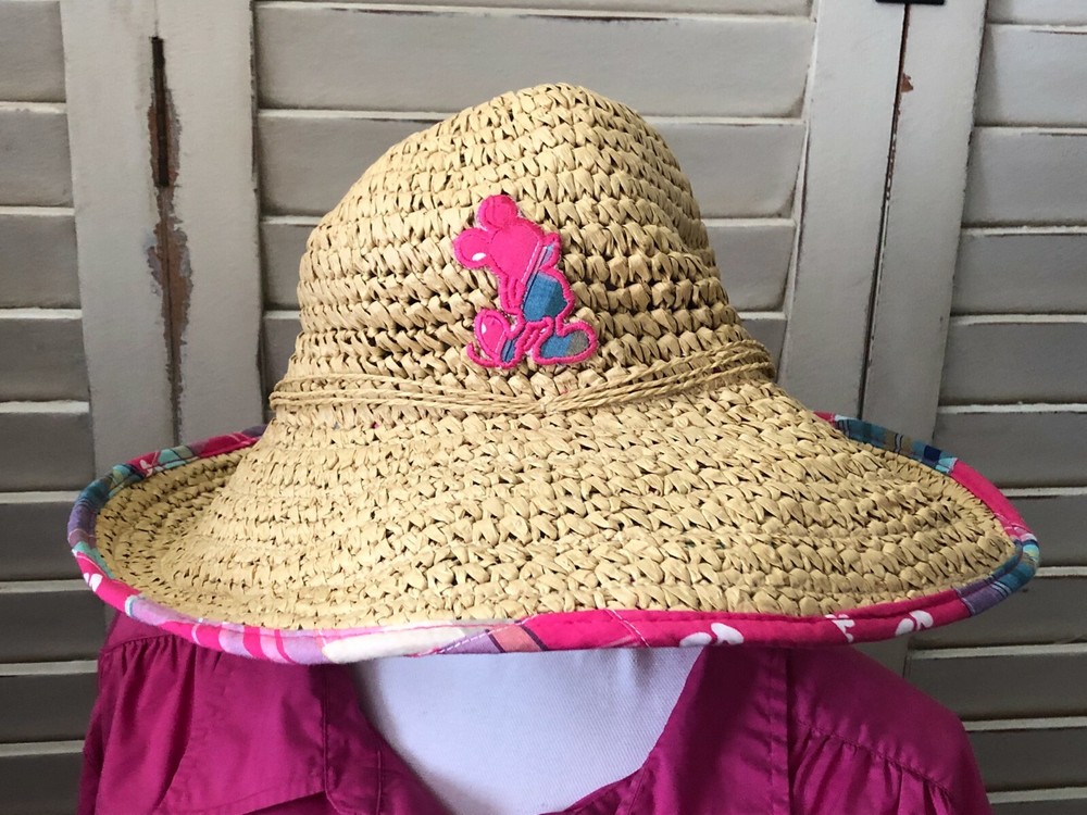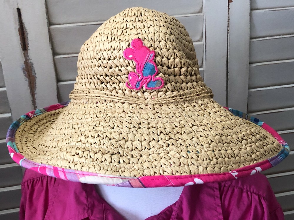 Disney Floppy Sun Hat Pink Patchwork Brown Straw WDW Adult Beach Mickey Mouse Approximately 16" for side to side straight across I cannot find another one listed or sold like this one. I can't remember which trip I purchased this one on either. I do know I have had it for years though. I have kept it on the top shelf of my closet for many, many years. I only wore it at WDW on the one trip I purchased it on and only one the day of purchase. It is in very, very good condition.
