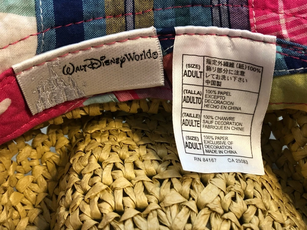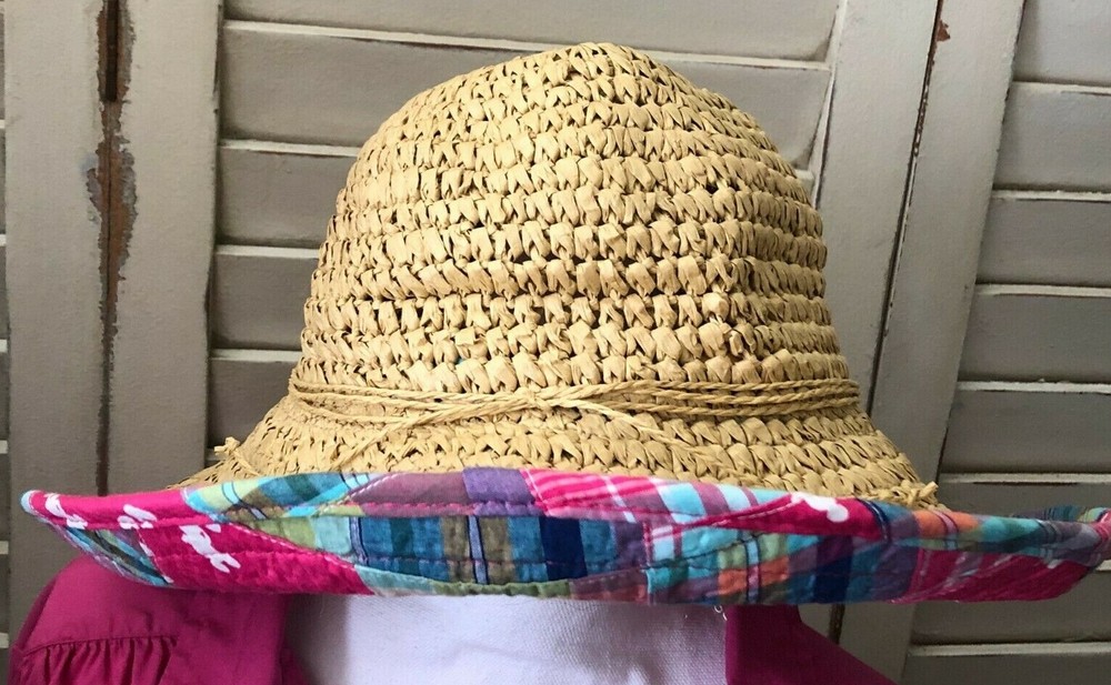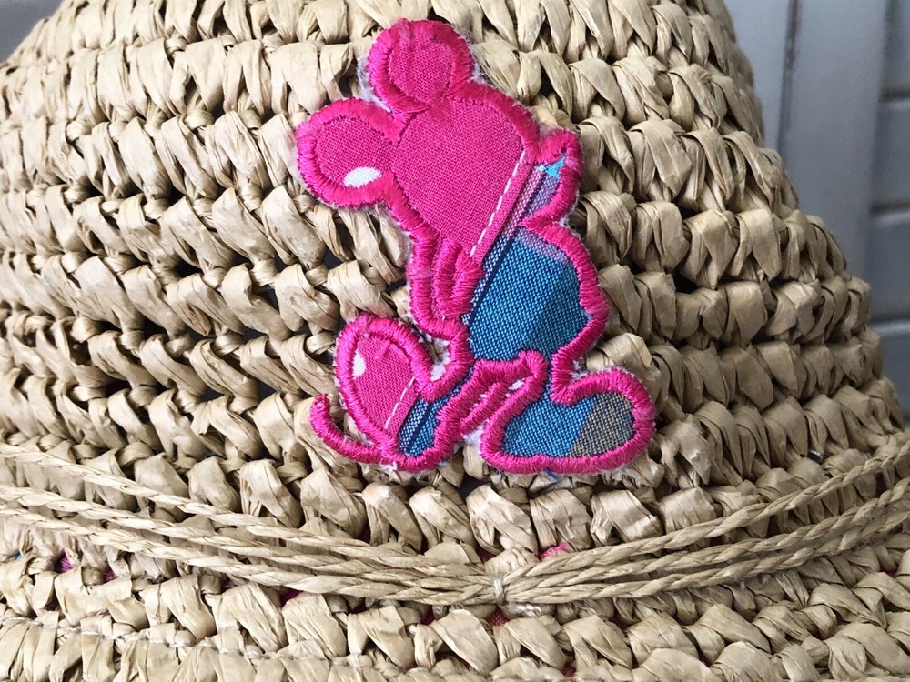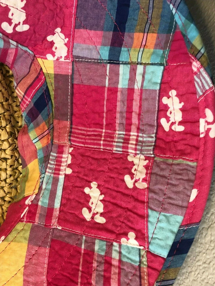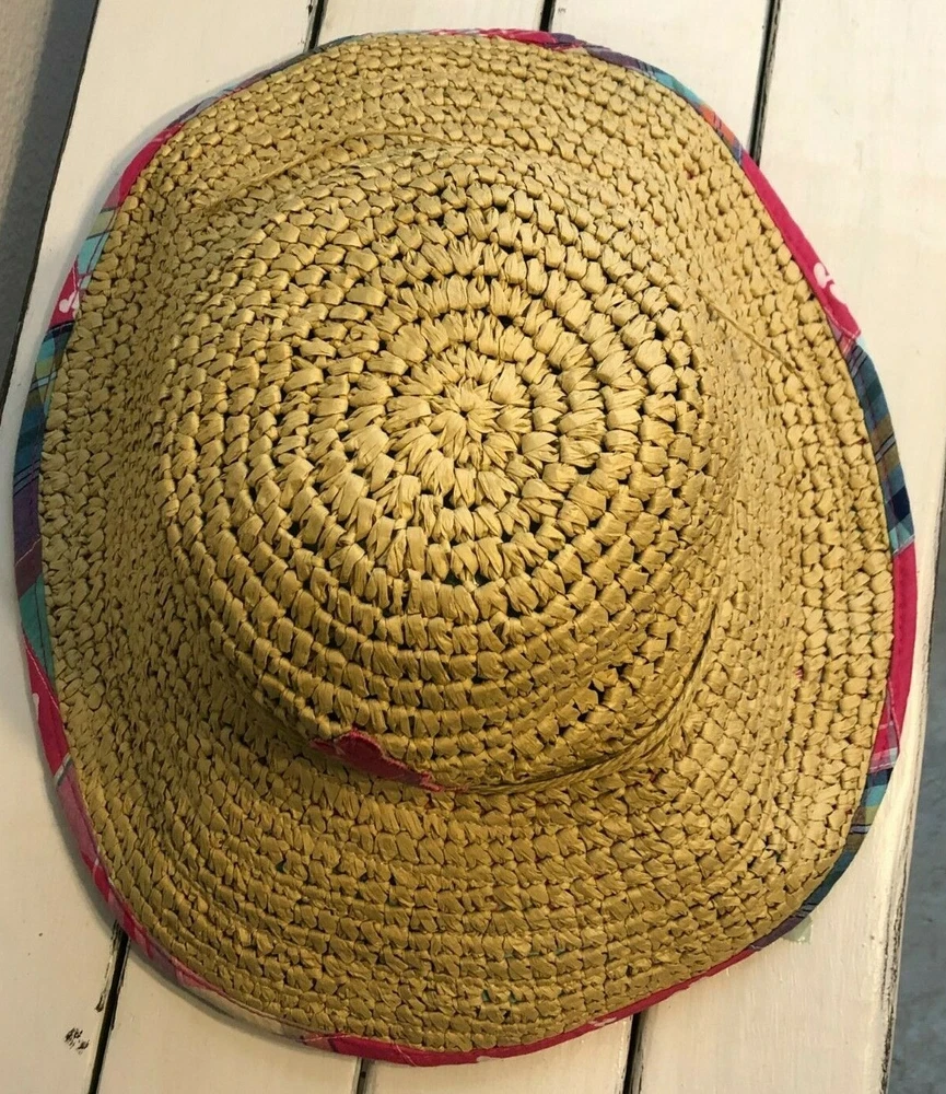 Disney Floppy Sun Hat Pink Patchwork Brown Straw WDW Adult Beach Mickey Mouse Approximately 16" for side to side straight across I cannot find another one listed or sold like this one. I can't remember which trip I purchased this one on either. I do know I have had it for years though. I have kept it on the top shelf of my closet for many, many years. I only wore it at WDW on the one trip I purchased it on and only one the day of purchase. It is in very, very good condition.