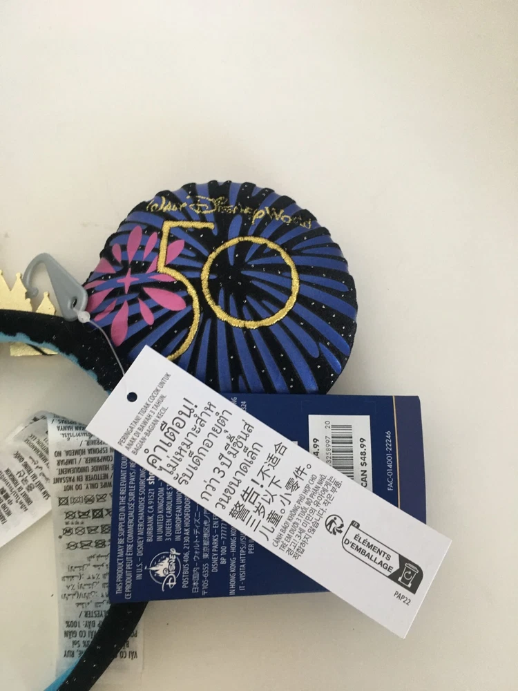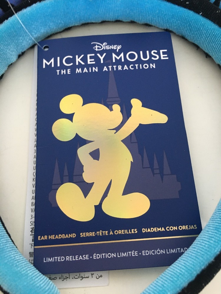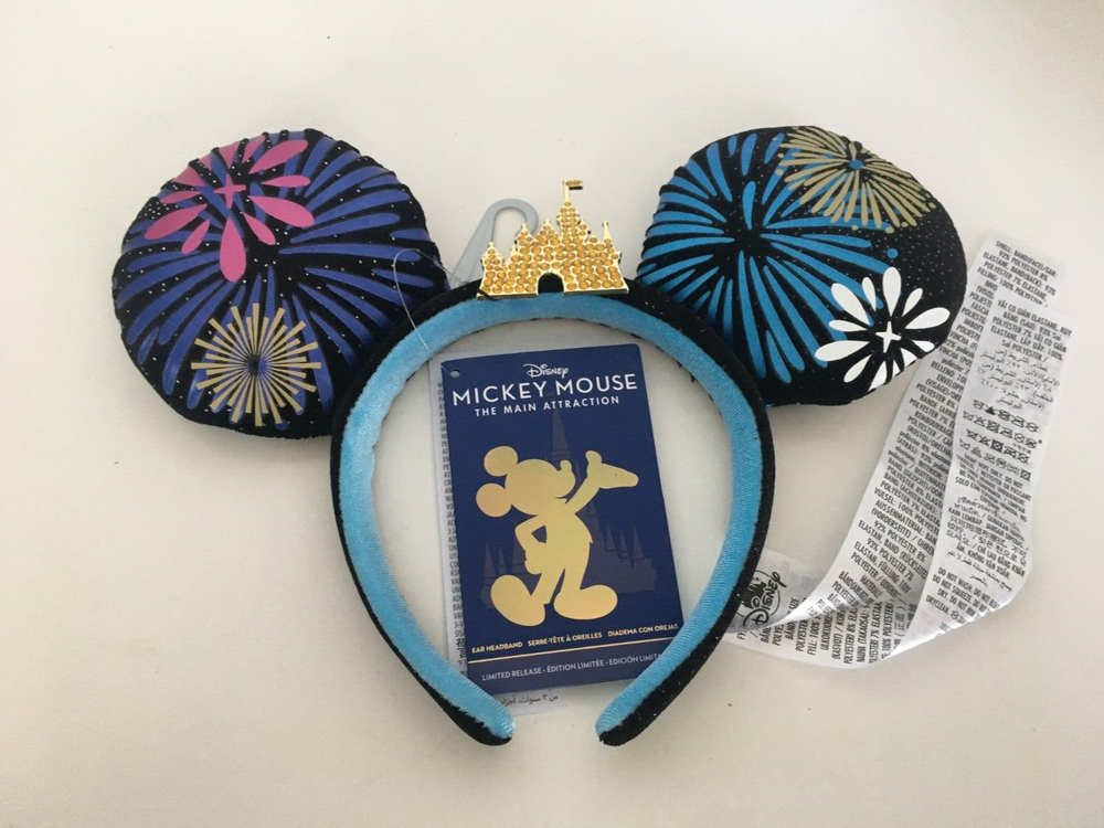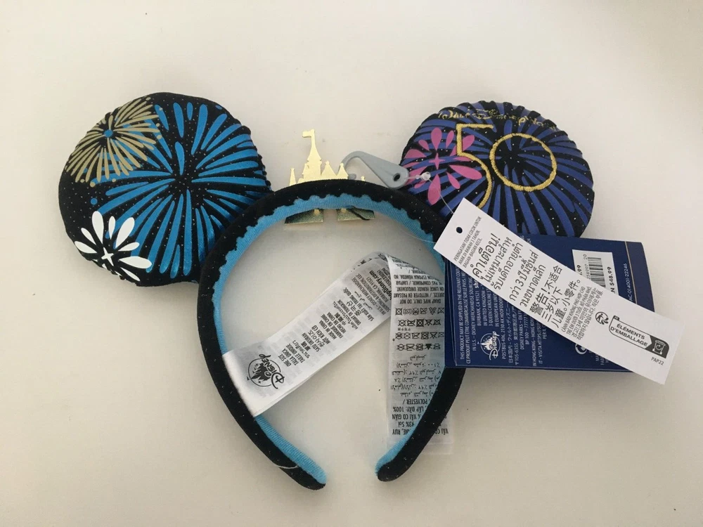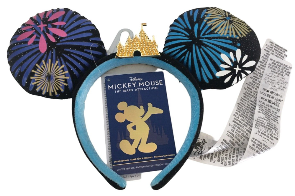 Disney Main Attraction Mickey Mouse Ears Velvet Headband Cinderella Castle Fireworks Walt Disney World 50th Anniversary Limited Release Faux leather fireworks and metallic flecks on padded mouse ears Golden, gem studded Cinderella Castle centerpiece Back of right ear features golden embroidered Walt Disney World logo Velour non-slip interior Approx. 8'' H x 8 1/2'' W x 1 1/2'' D Adult, One Size