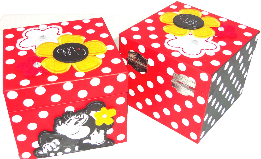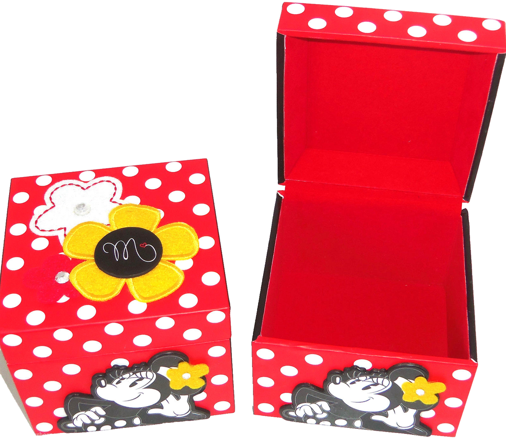 Minnie Mouse Jewelry Box Pictures shows around the box, this is for ONE Red Velvet Lining Decorated with felt & fake gems 3 1/2" tall x 4 1/8" wide New Thanks for visiting, please come again!!!!