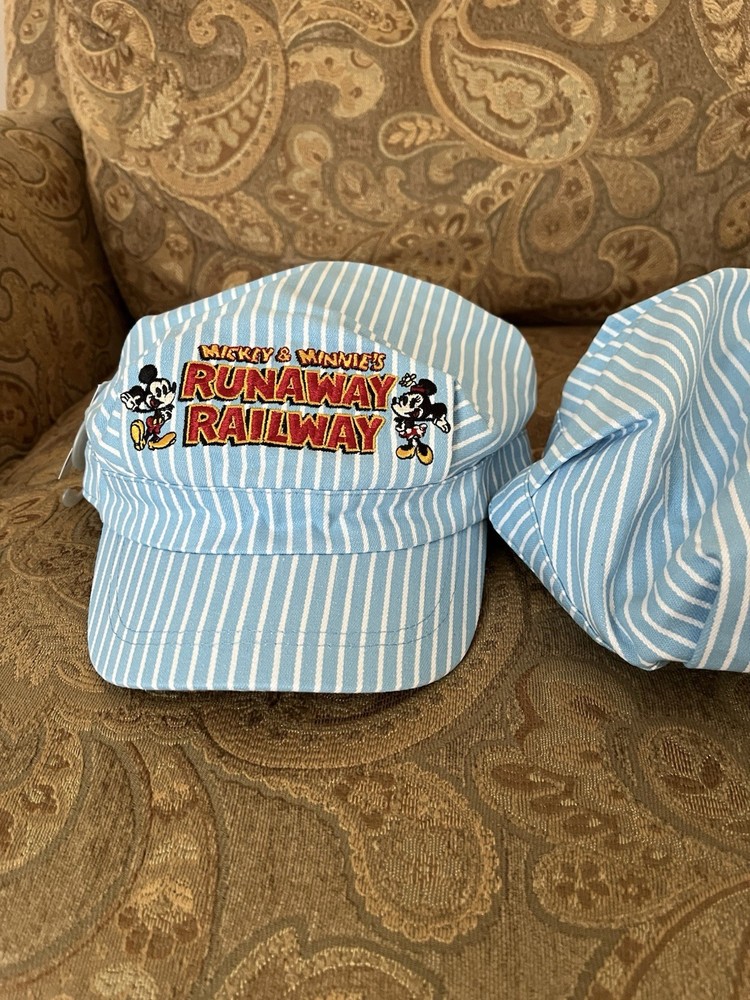 Brand new with tags adult blue and white stripe Mickey and Minnie Run away Railroad Conductor Hat. Would make a great addition to any Disney lovers collection....