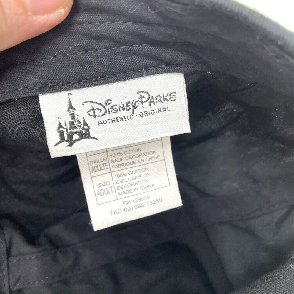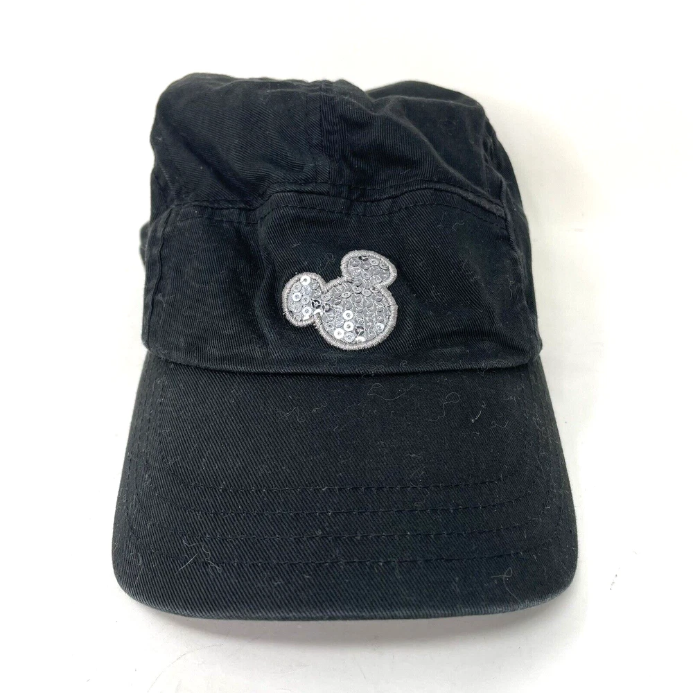 This is a Disney Parks women's cadet newsboy hat in black with a silver sequin Mickey Mouse design. It is suitable for adult women and part of the Disney franchise. The hat features a contemporary style and is one size fits all. The back of the hat is adjustable. Perfect for adding a touch of Disney magic to any outfit, especially for fans of Mickey Mouse and Disney Parks.