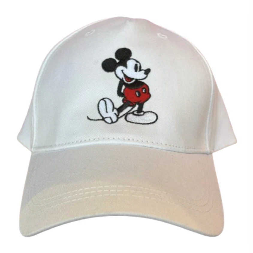 Embroidered standing Mickey on the front Embroidered Walt Disney World logo on back Button topper Embroidered eyelets Adjustable back strap with metal buckle One size fits most adults 100% cotton, exterior and brim 100% Polyester lining Imported From pet and smoke free environment New with tag