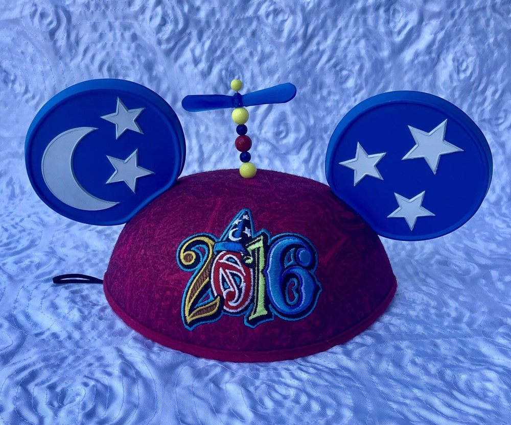Used good condition. Some creases in gel. Spinner is crooked. Celebrate the year in style with this "2016" logo ears hat from Walt Disney World. With an iron-on and colorful "2016" on the front, and ''Stars'' and ''Moons'' on the ears and a spinning propeller topper on the hat itself, you can go out on the town in style with this set of ears. Ear Hat with 2015 Walt Disney World logo ''2016'' lettering Spinning propeller topper One size Polyester with plastic ears Imported