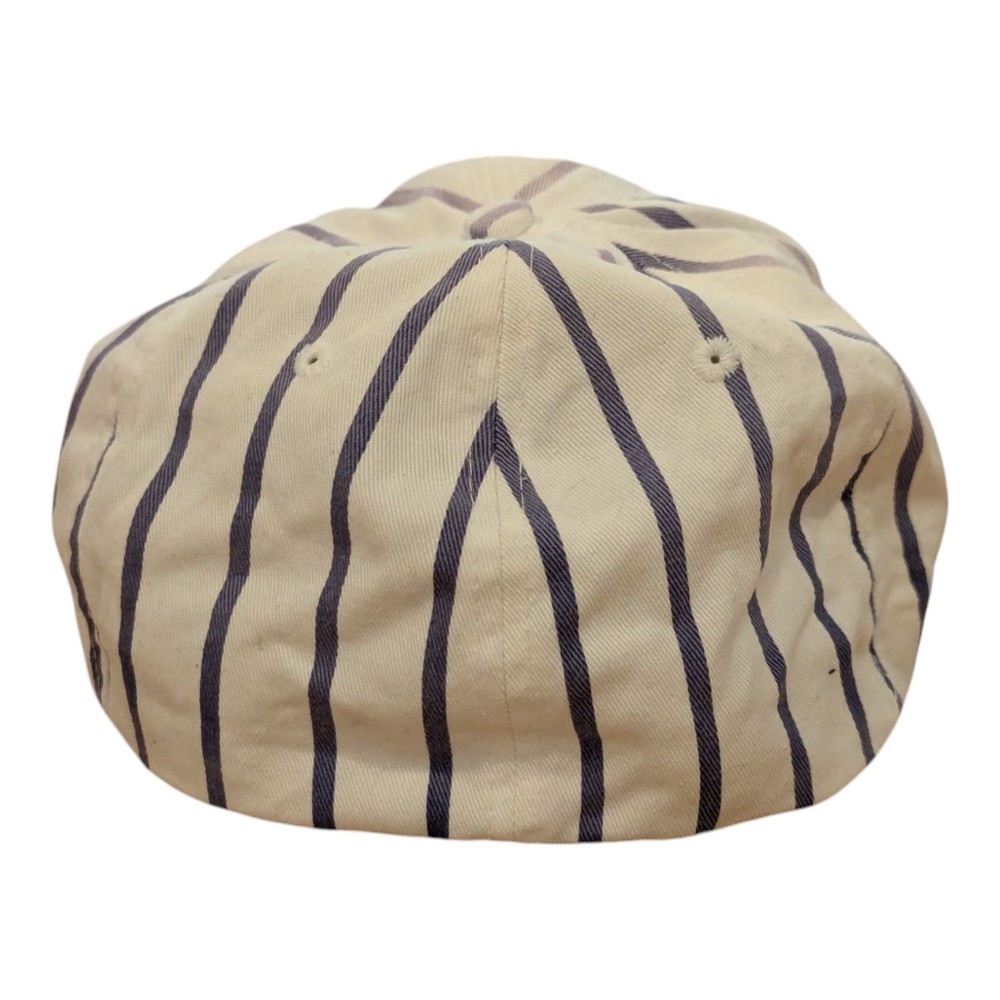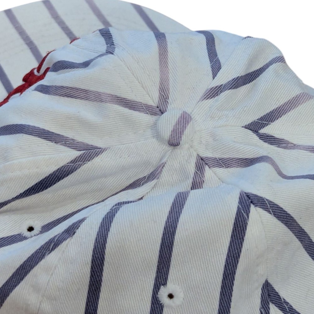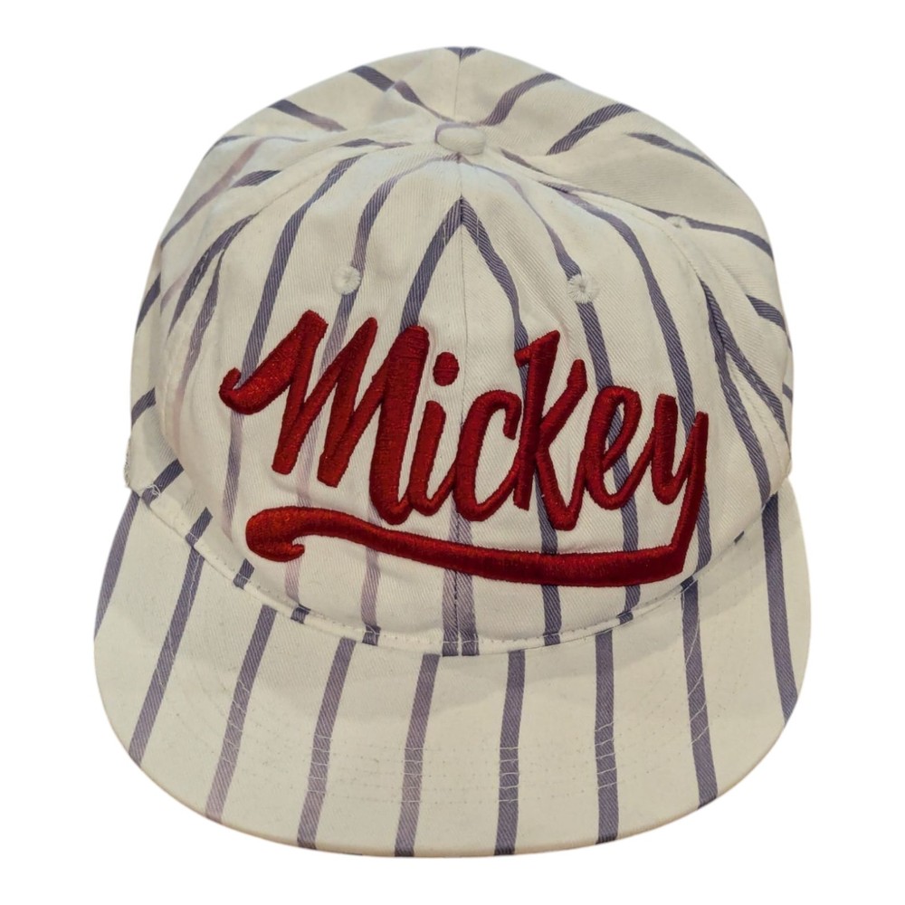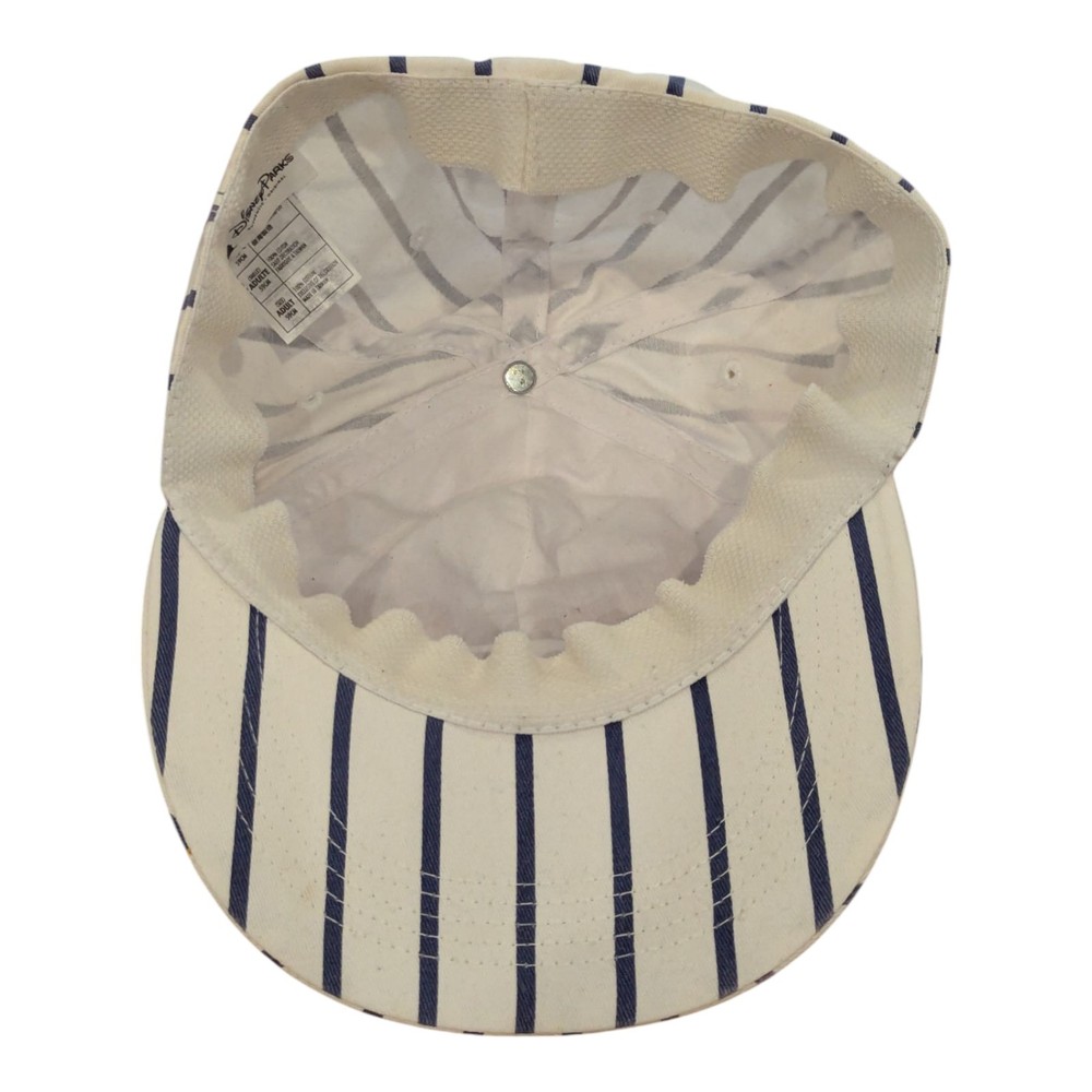 Disney Parks Mickey Mouse Pin Stripe Hat White Blue Adult Embroidered 59cm Pre-owned Prewashed in detergent Has an elastic band on the inside to stretch size. Some fading to blue stripes and discoloration. Refer to pictures for overall condition.