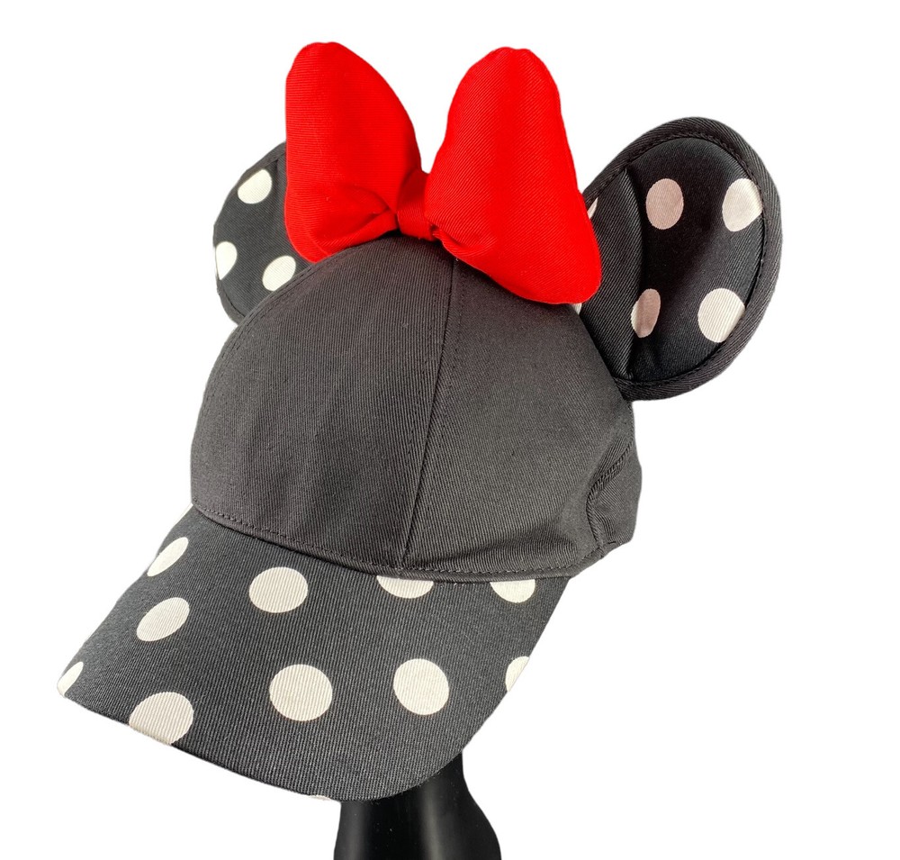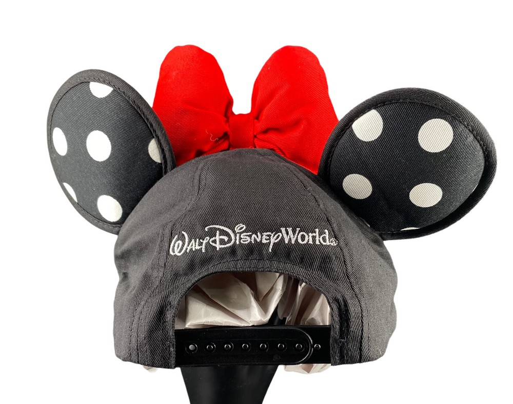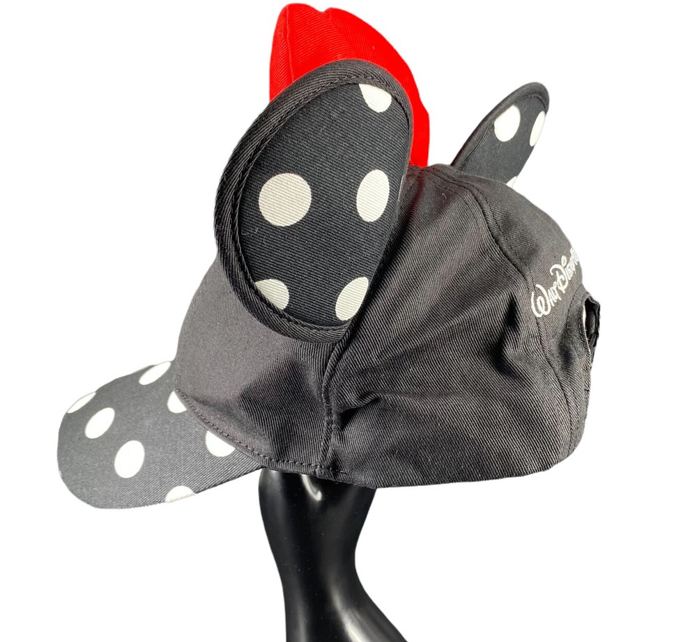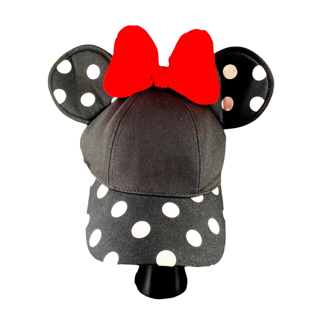 Add some Disney magic to your outfit with the Minnie Mouse Black-White Polka Dot Ears Red Bow Adult Baseball Hat from Walt Disney World. This hat is perfect for Disney lovers of all ages and features the iconic Minnie Mouse ears with a classic red bow on a black and white polka dot cap. Whether you're heading to the park or just want to add some fun to your everyday look, this hat is a must-have. Made in Taiwan for the Disney franchise, this baseball hat is a great addition to any Disneyana collection. It's perfect for fans of Minnie Mouse and Walt Disney World and is sure to become a cherished item for years to come. This hat is new and the color is a dark black. The photos make it look washed out/faded. -221242