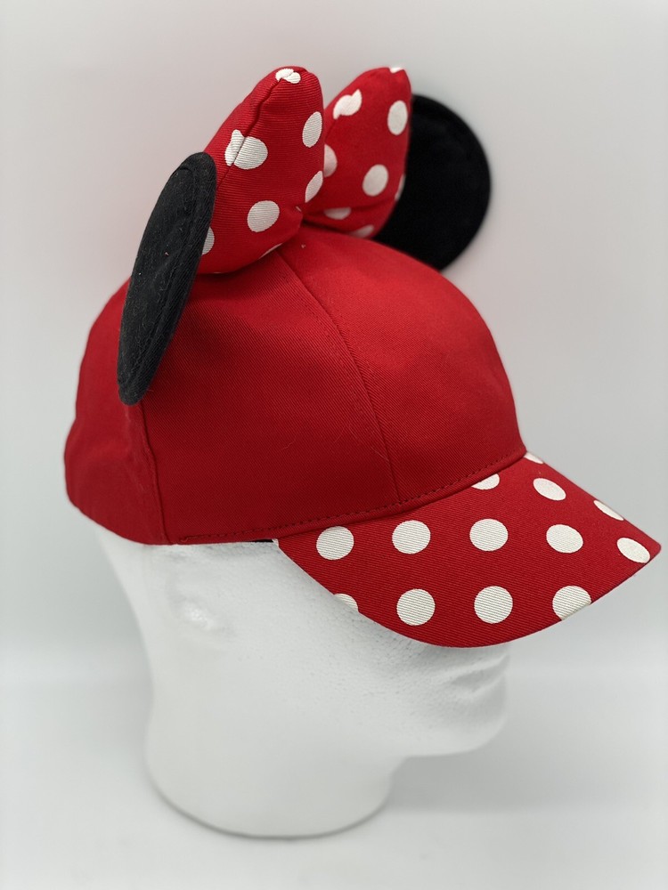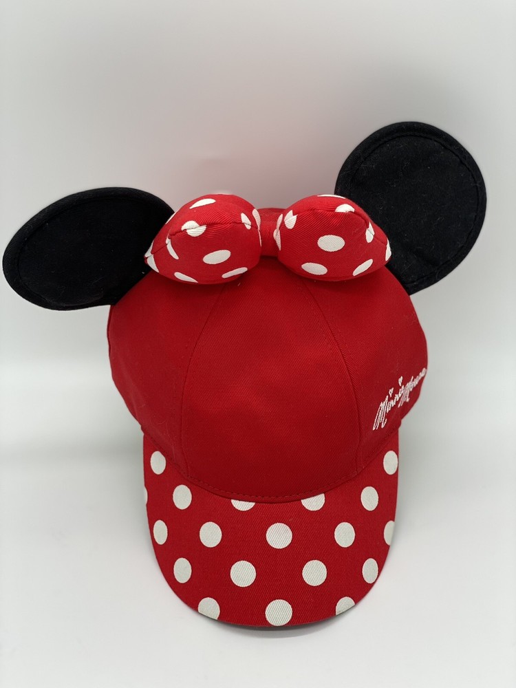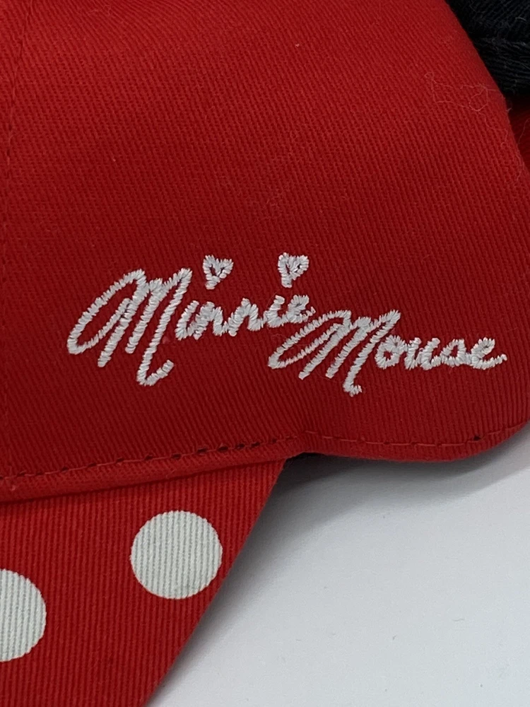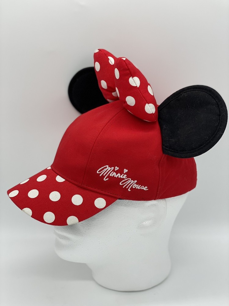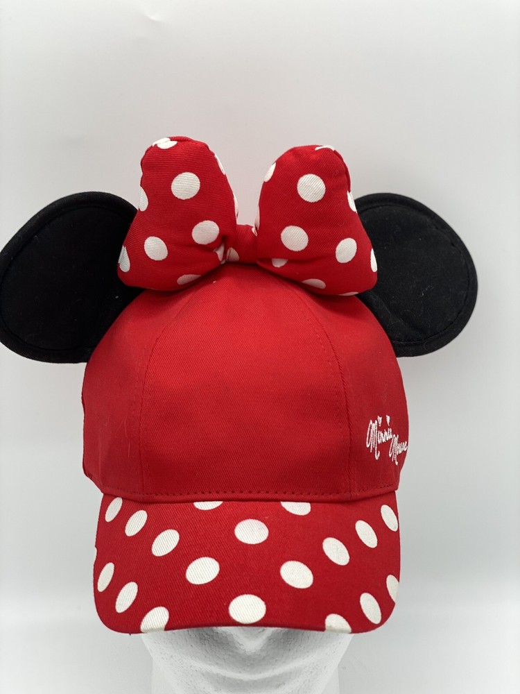 Disney Parks Minnie Mouse Baseball Cap With Black Ears, Red Bow & White Polka Dots on the Bow & The Bill of the Hat. Minnie Mouse's Signature, With Two Hearts, Is on the Left Side Of The Hat. A Great Addition To Your Minnie Mouse Hat Collection.