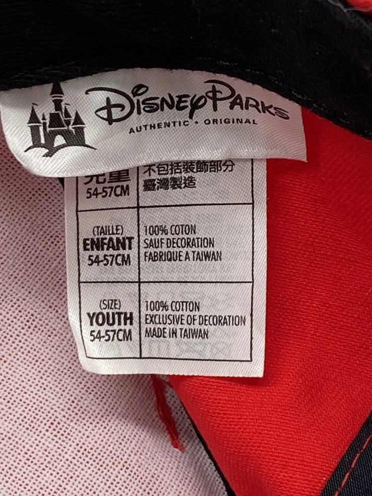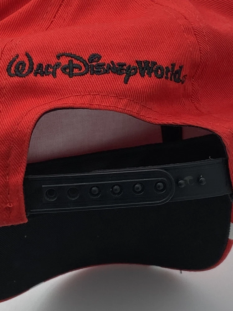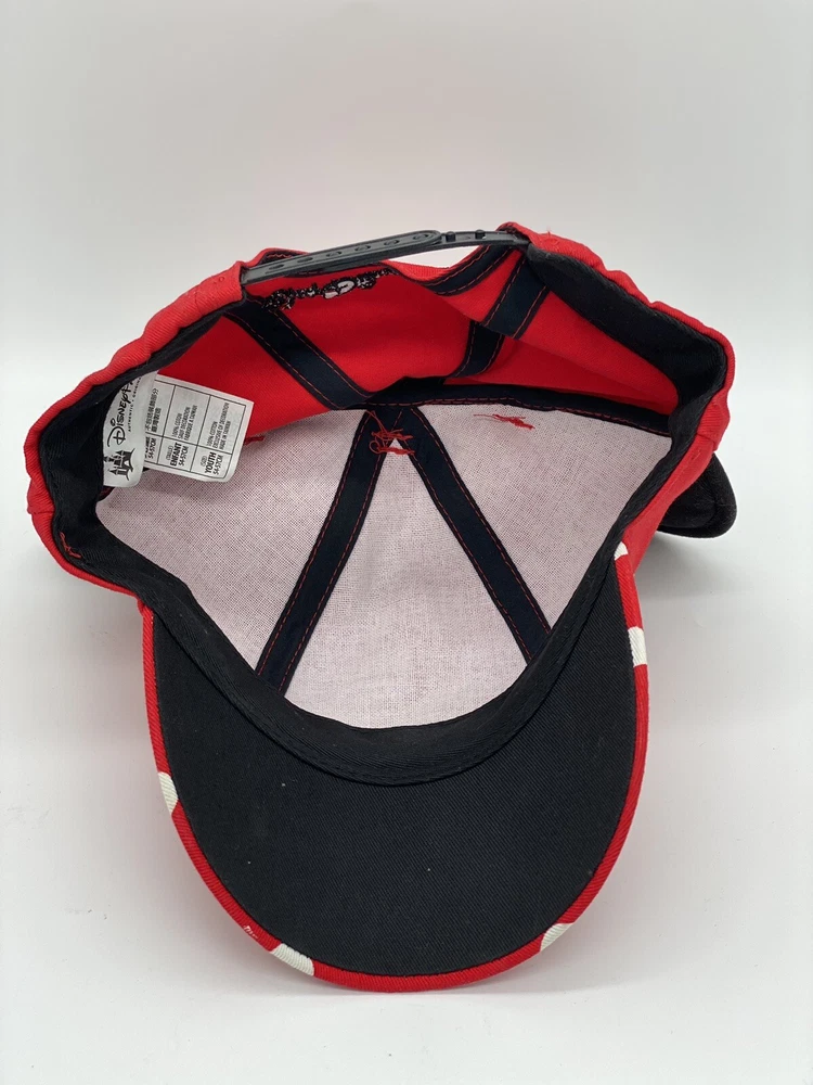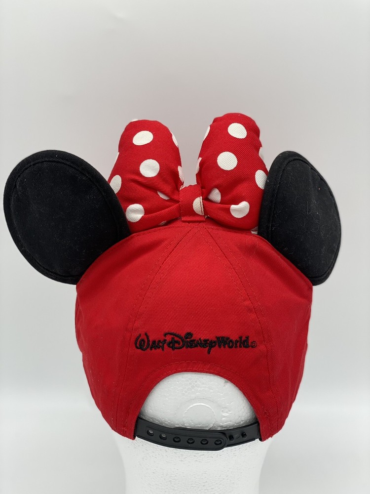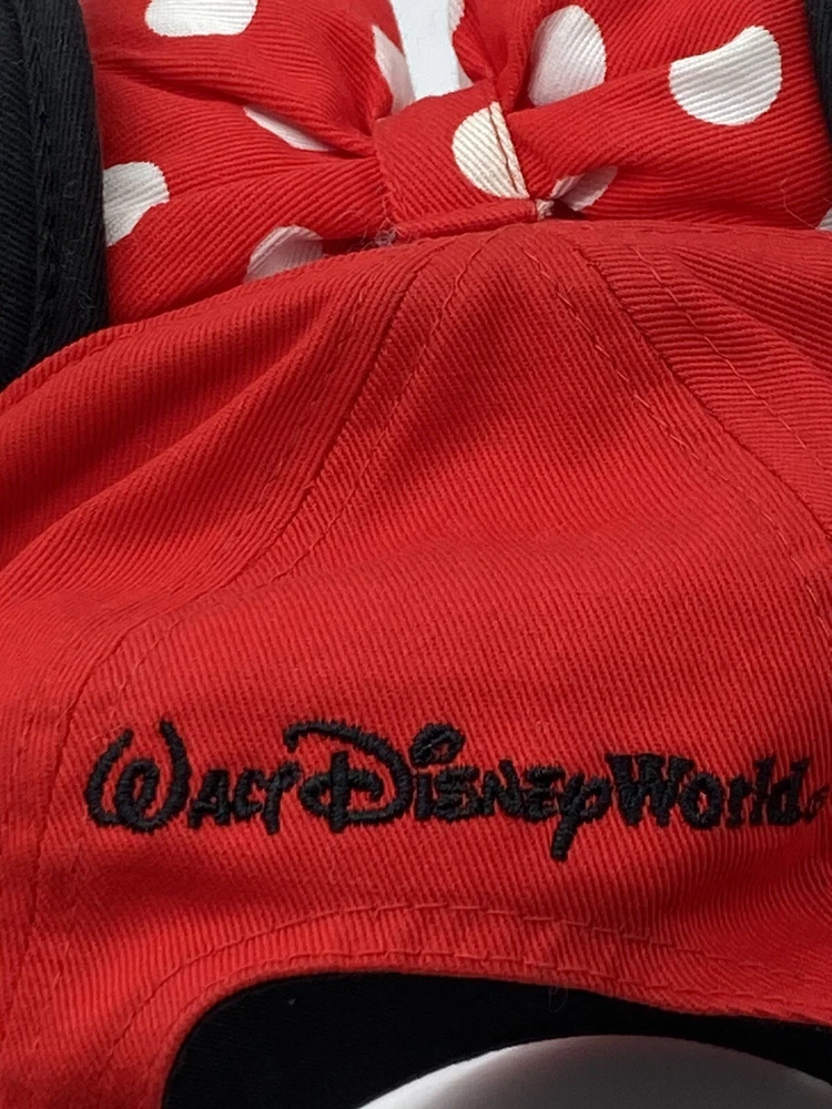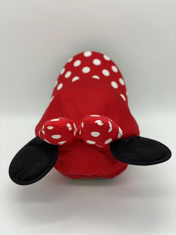 Disney Parks Minnie Mouse Baseball Cap With Black Ears, Red Bow & White Polka Dots on the Bow & The Bill of the Hat. Minnie Mouse's Signature, With Two Hearts, Is on the Left Side Of The Hat. A Great Addition To Your Minnie Mouse Hat Collection.