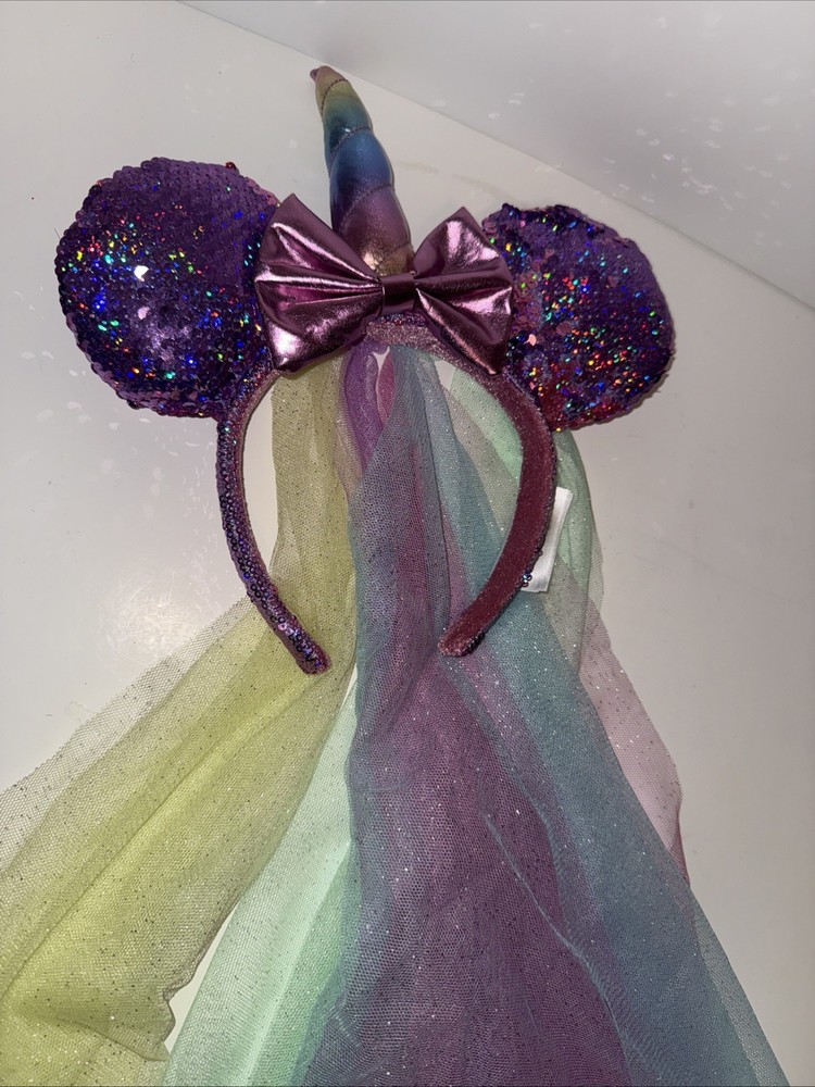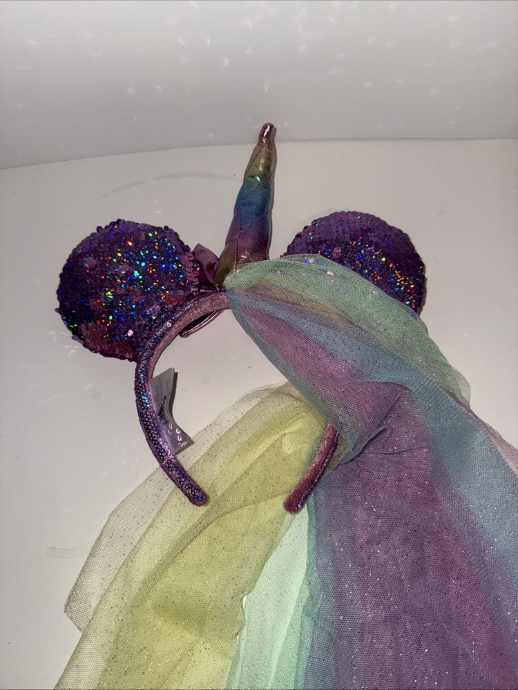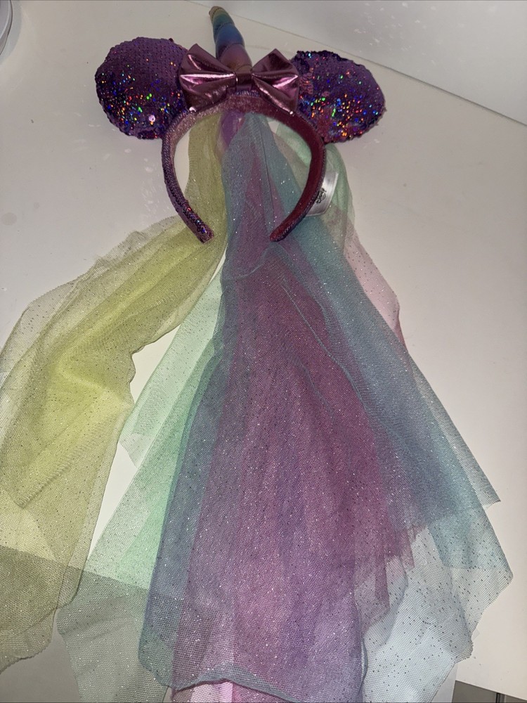 The Disney Parks Minnie Mouse Unicorn Pink Sequin Rainbow Tulle Veil Ears Headband is a whimsical and colorful accessory inspired by the beloved Disney character Minnie Mouse. Designed for adults and featuring a pink color with rainbow tulle details, this headband is perfect for fans of Disney and those looking to add a touch of fun and magic to their outfit. Officially licensed by Disney, this contemporary piece is a must-have for collectors and enthusiasts of Disneyana.