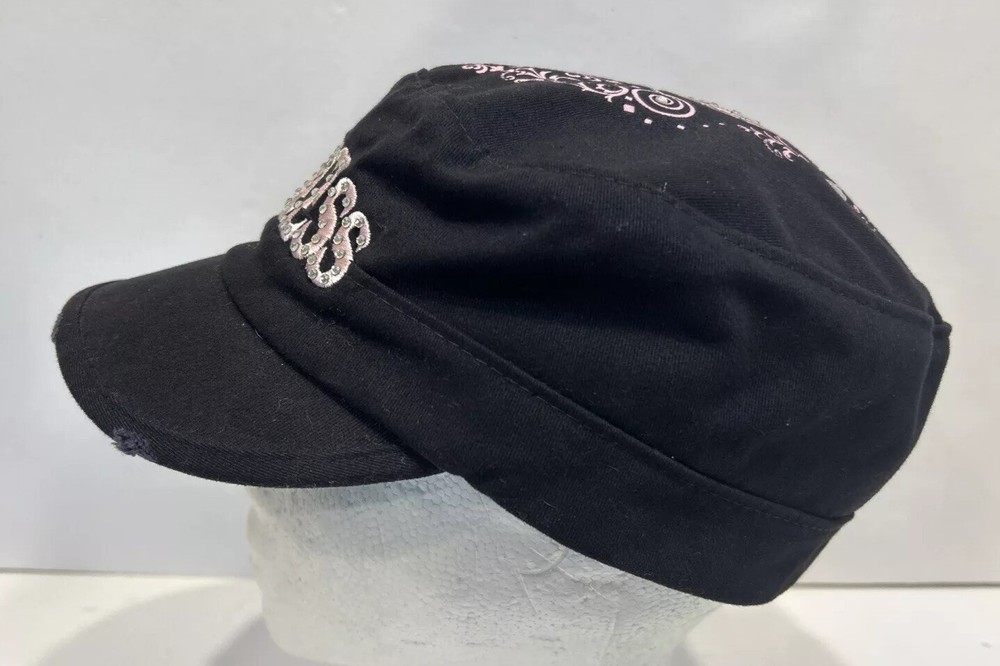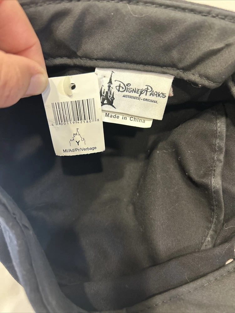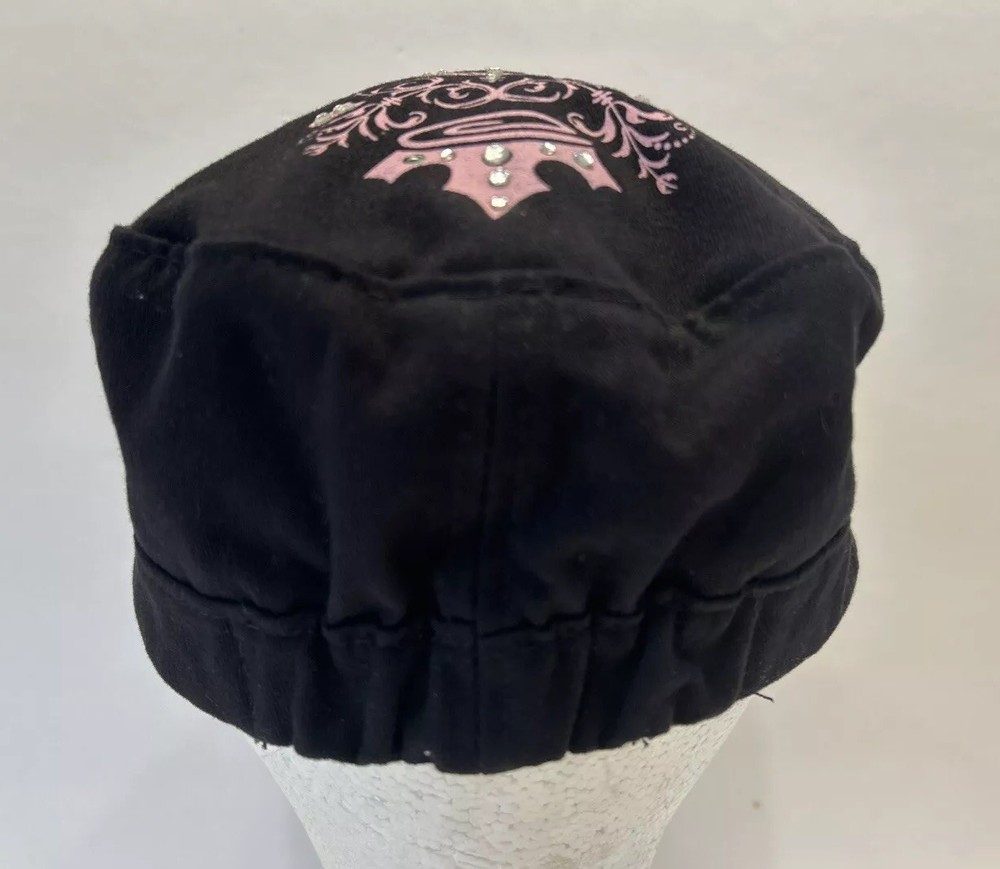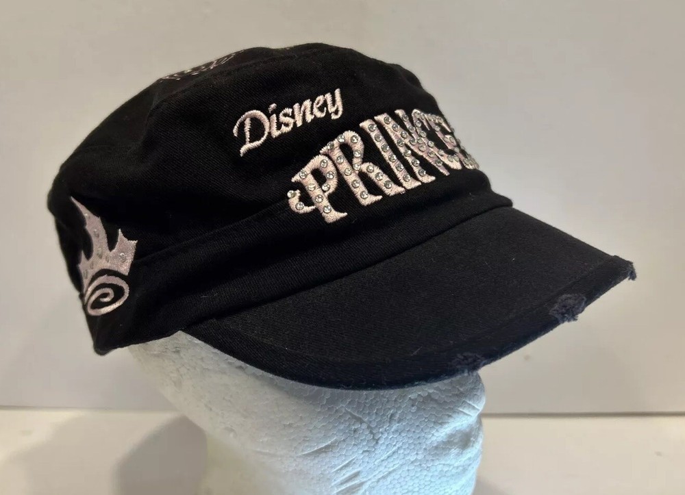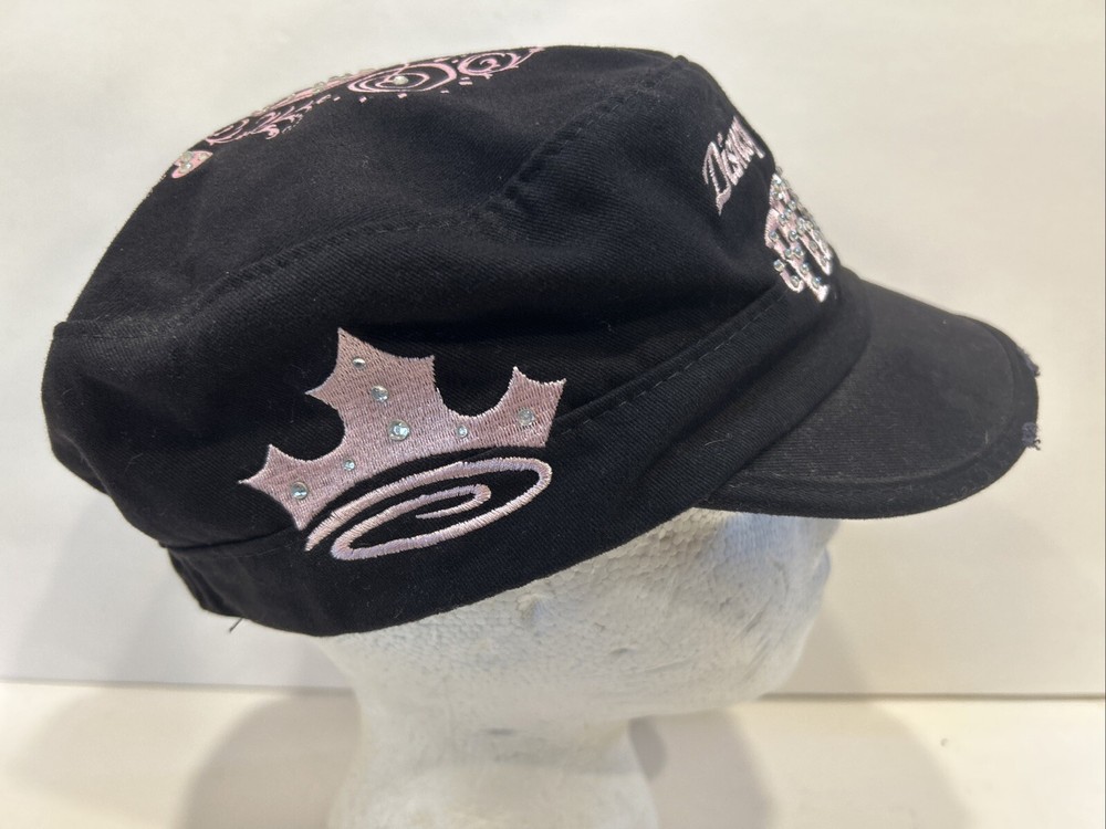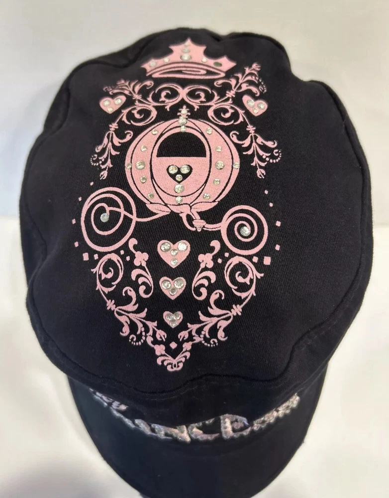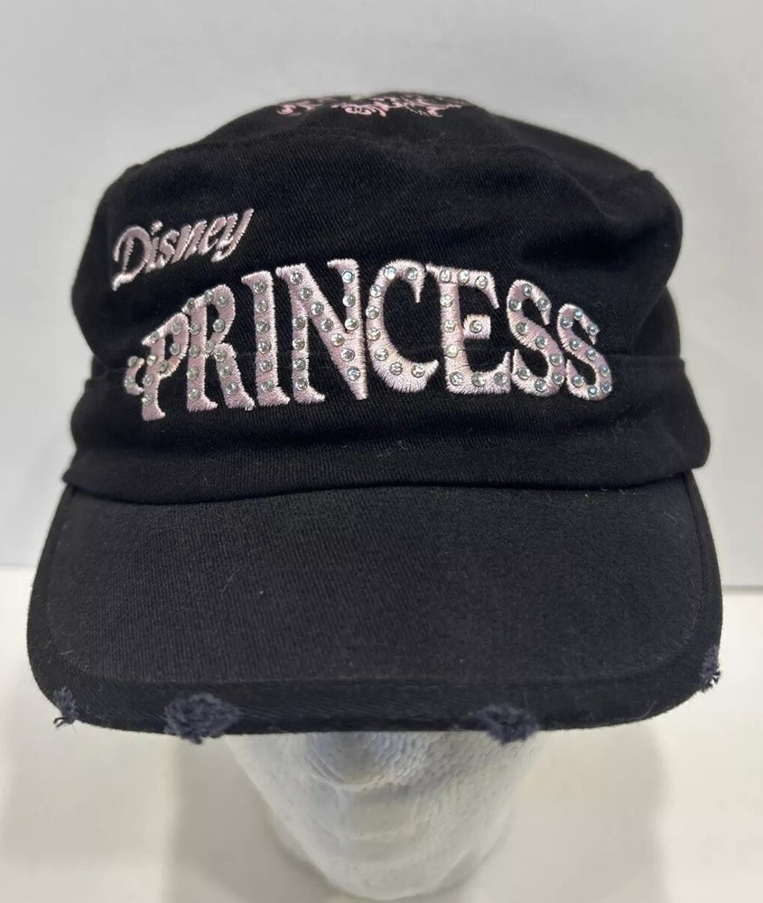 Super cute youth sized Disney Princess hat is perfect for your next Disney Day. This genuine Disney Parks cap is new with tags. The hat is a flat top painter/ army style hat and is black with pink castle and Cinderella’s carriage accents. This hat also has tons of bling with rhinestone accents everywhere. Hat also has an elastic back for a perfect and comfortable fit.