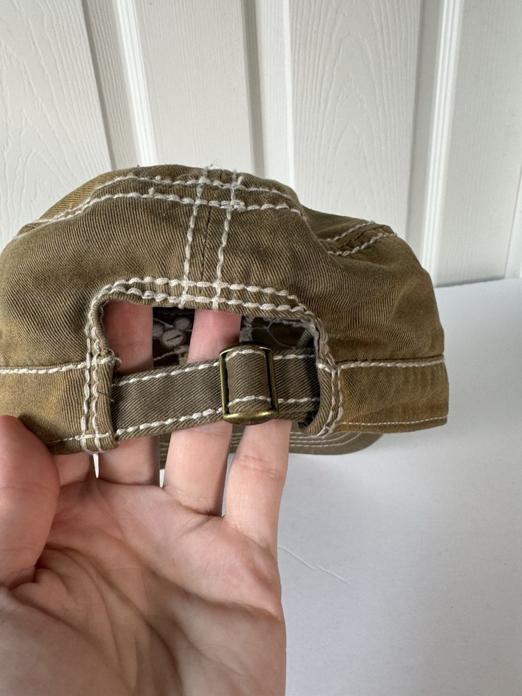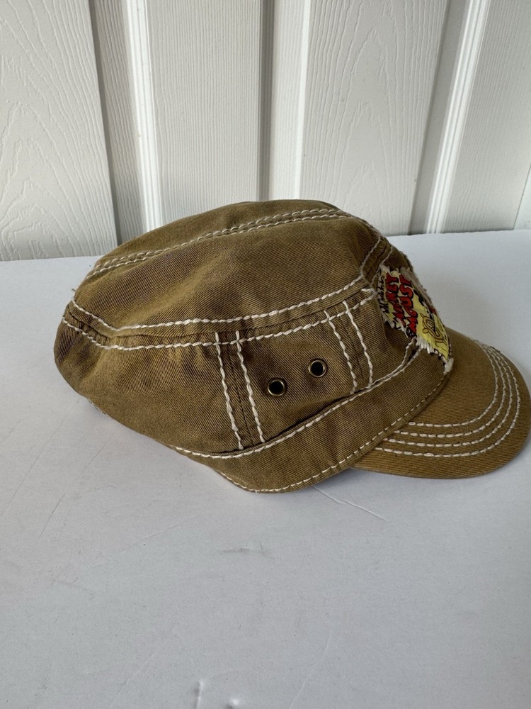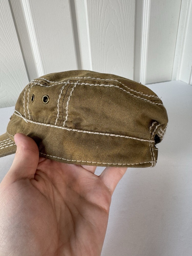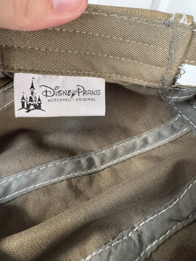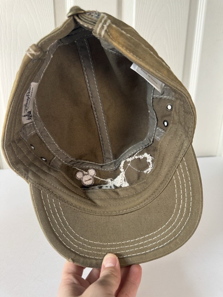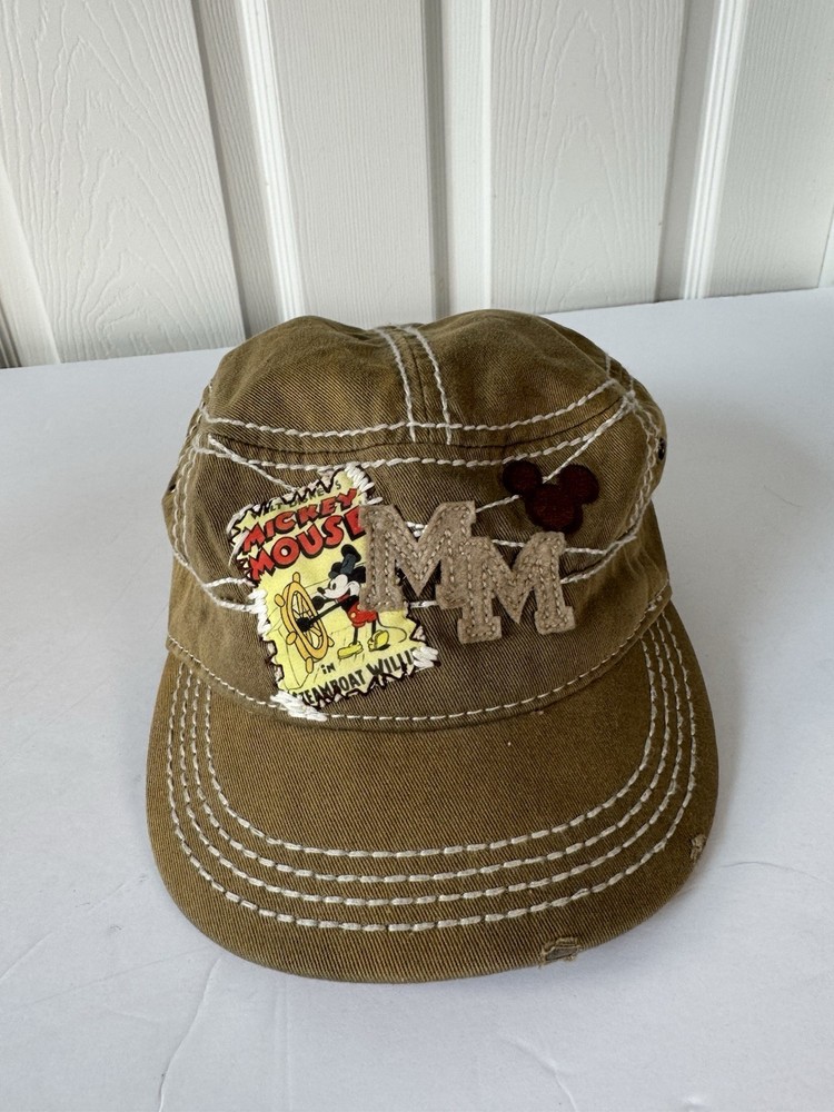 Disney Parks Steam Boat Willie Mickey Mouse Military Style Hat Adjustable Back Contrasting white stitching, army green has intentional discoloring in areas, patch work details in front, bill is in great condition, adjustable back, one size fits most.