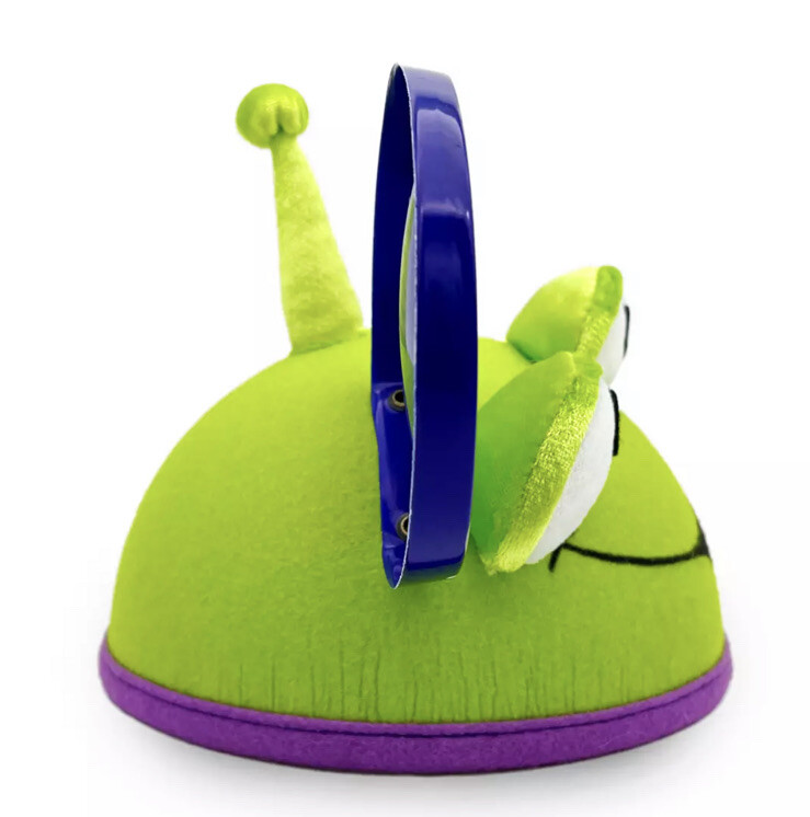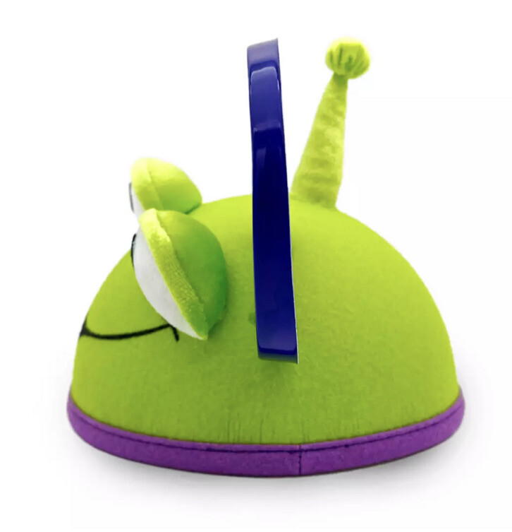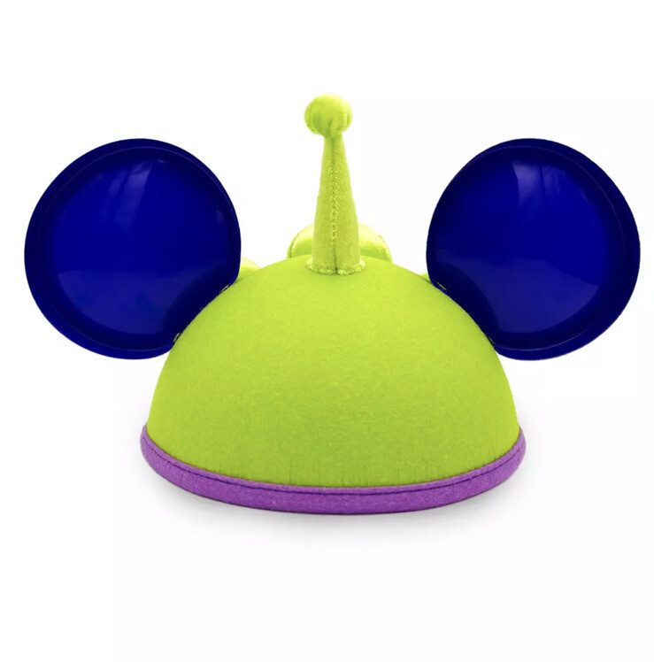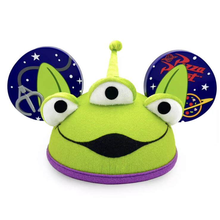 Disney Parks Toy Story Alien Mickey Ears Hat Adult Size New With Tags!. With an additional three eyes on the top of your head, you'll be better able to see all the smiles you generate when walking around in this Space Alien ear hat. Inspired by Toy Story's lime green inhabitants of Pizza Planet's Space Crane game, it features the looming menace of their master The Claw. Magic in the details Felt dome Plush eyes and antenna Plastic ears Pizza Planet logo on left ear The Claw on right ear Elastic chin strap Inspired by Toy Story The bare necessities Hat dome: polyester Ears: PVC 11 2/5'' x 5 1/2'' x 8 2/3'' Imported