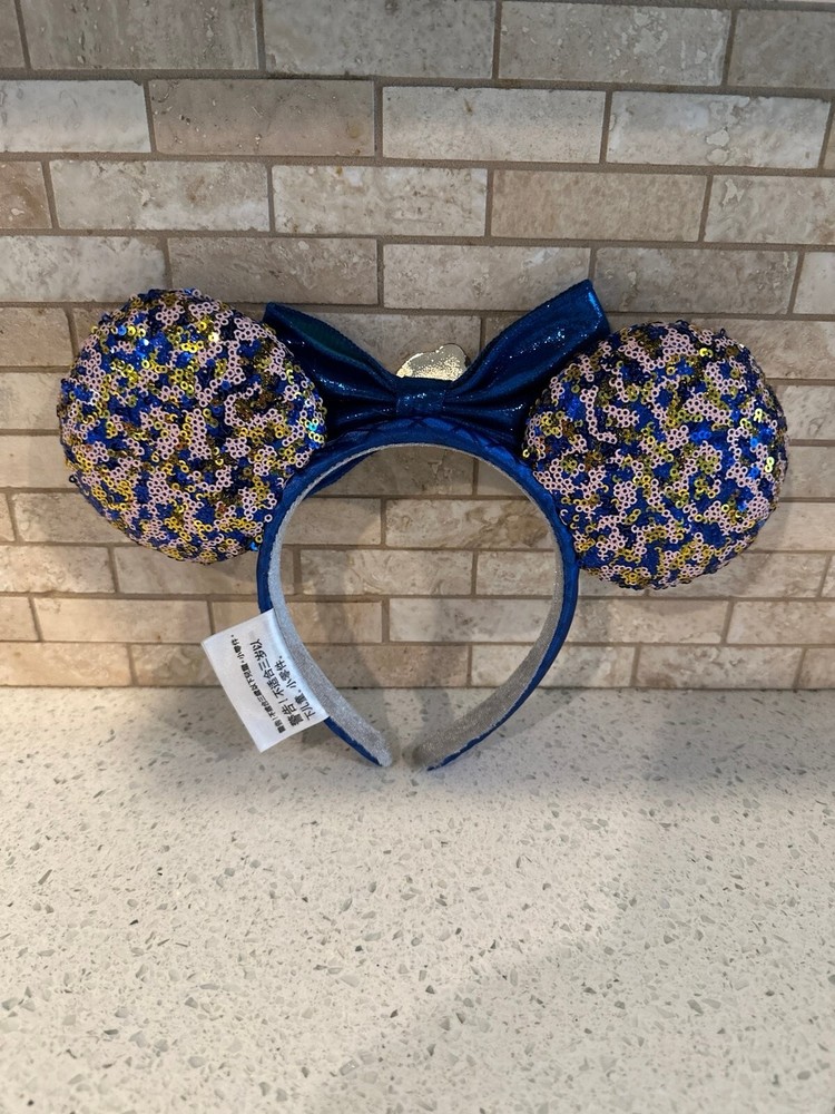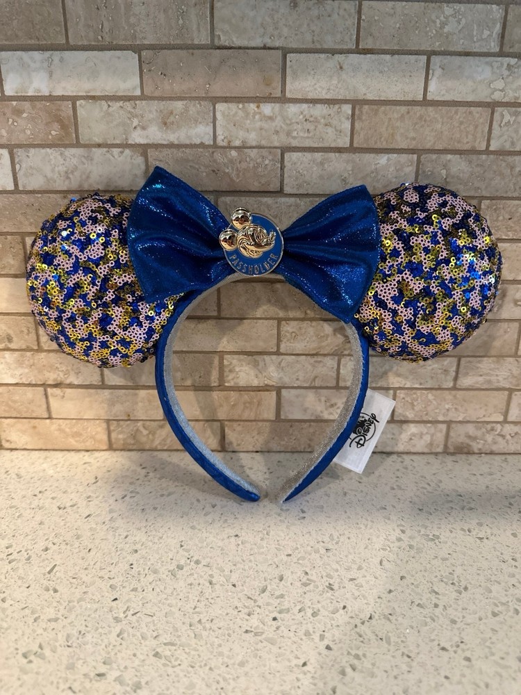 Disney Parks Walt Disney World 2021 Annual Passholder Exclusive Blue & Gold Sequined Minnie Mouse Bow & Mickey Ears Add to your Disney collection with these passholder exclusive Mickey Mouse ears! The band is a plush, royal blue on top and silver underneath the band. The ears are covered in multicolored sequins, mostly blue and gold and there is a royal blue shimmery Minnie bow with a Mickey Mouse Passholder accessory attached. In great condition! Measures 14" around when measured from inside the band.