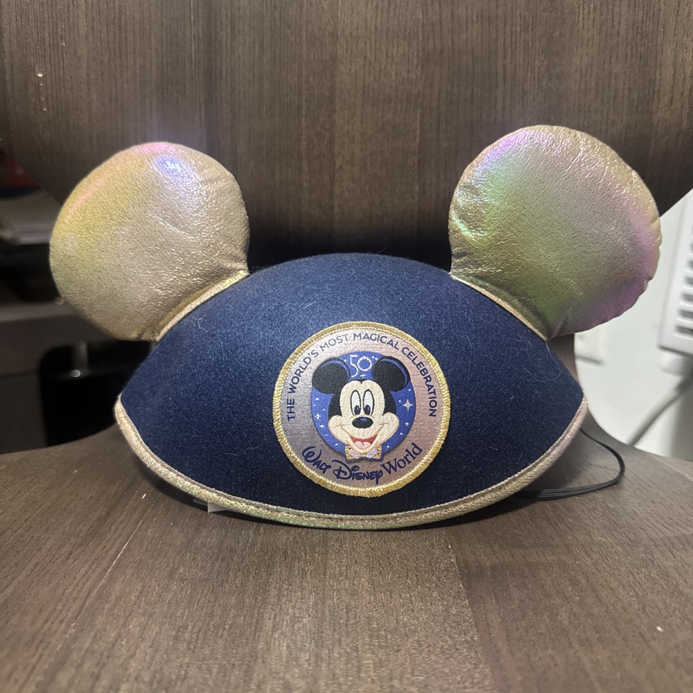 Celebrate a magical milestone with the Disney Parks Walt Disney World 50th Anniversary Adult Mickey Mouse Ear Hat. A iconic piece of Disney memorabilia, this ear hat commemorates the enchanting history of Walt Disney World with its special 50th Anniversary design featuring the beloved Mickey Mouse. Perfect for Disney enthusiasts and collectors, this contemporary ear hat is a must-have for its nostalgic value and charming appeal. Crafted with the quality you expect from the Disney brand, it's a delightful addition to any Disneyana collection or a festive accessory for your next park adventure. Join in the celebration of Disney's rich legacy with this special edition Mickey Mouse ear hat.