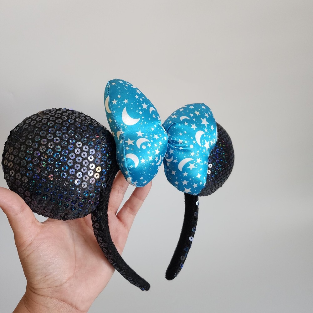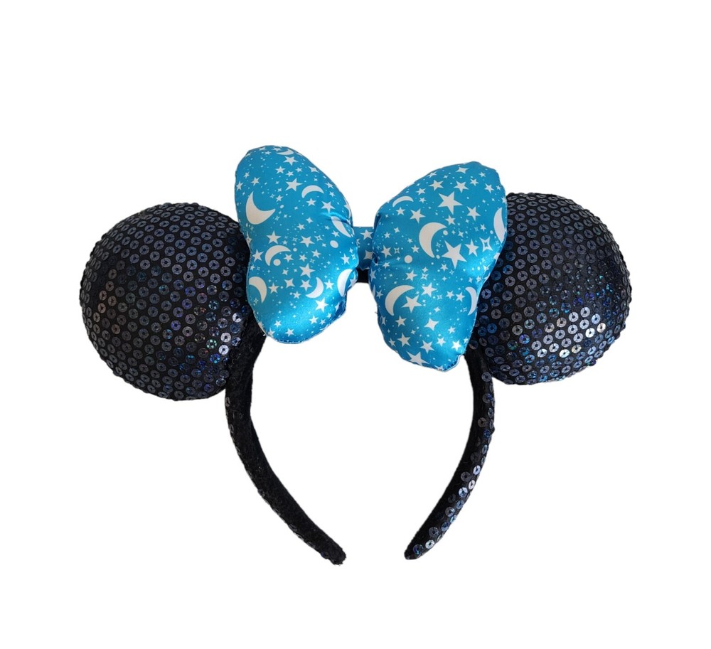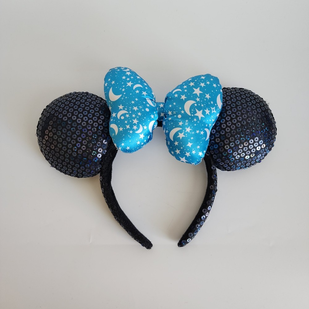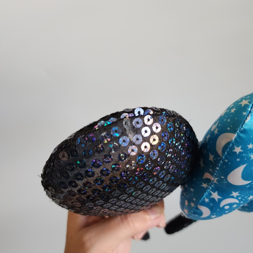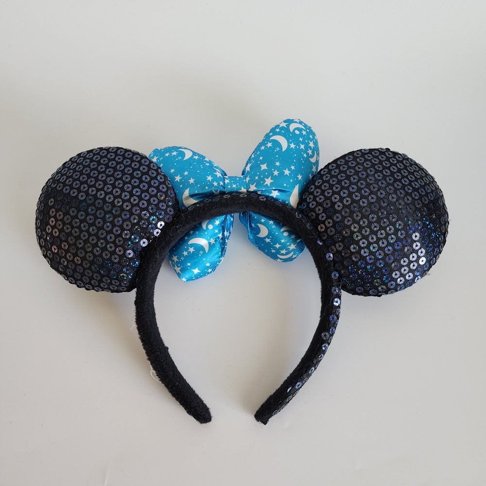 Disney Parks Walt Disney World Minnie Mouse Sorceror Moon Star Glitter Sequin Puffy Bow Ears Adult Disney, Disneyland, DLR, WDW, Blue, White, Sequin, Sparkle, Bow is puffy, ONE SEQUIN IS MISSING but overall in good condition but see pictures for more details!