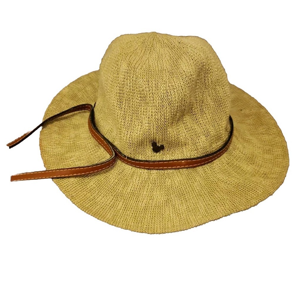 Disney Parks Branded Safari Style Sun Hat - Woven Tan with Brown Leather Band Small Mickey Detail. Size "Adult"