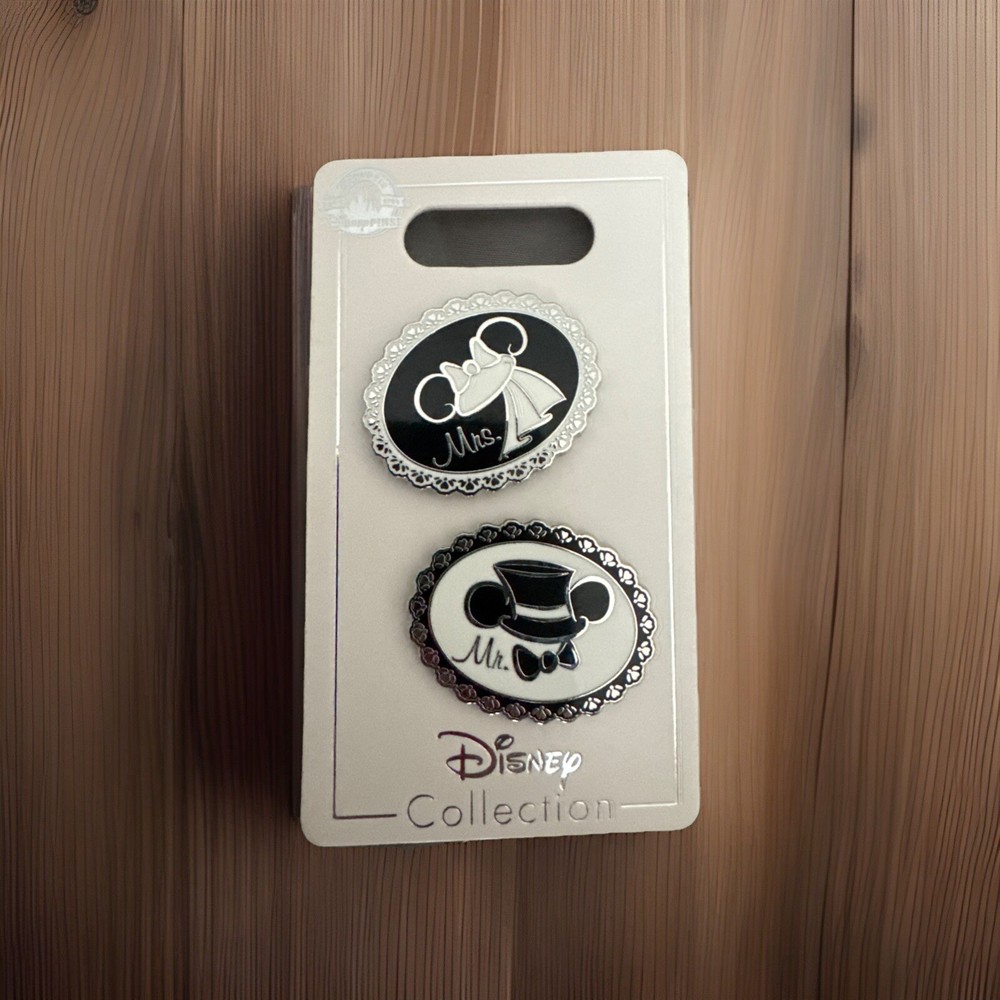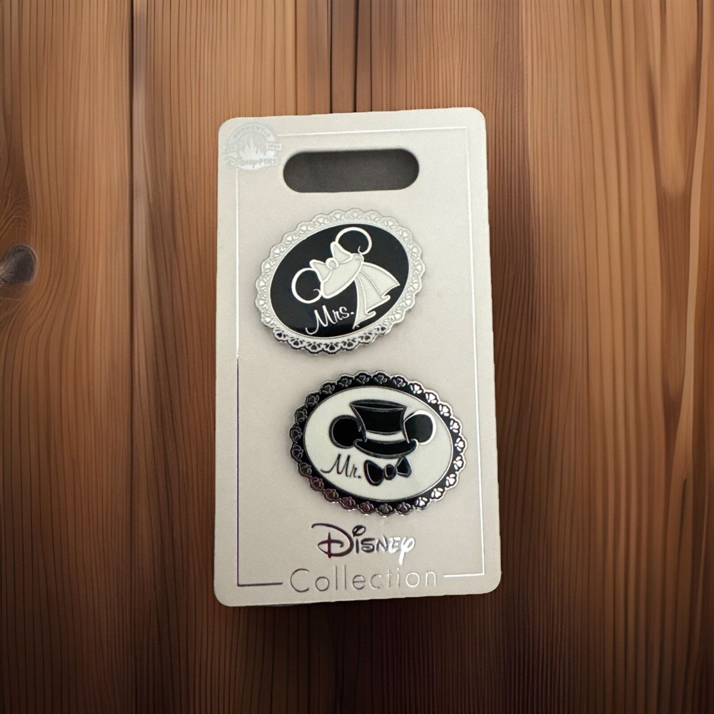The Disney Pin - Walt Disney World Wedding Ear Hats Mr and Mrs Set is a collectible pin set released by Disney Parks in 2009. The set features iconic Walt Disney World imagery and is themed around weddings, making it a unique and charming addition to any Disney pin collection. This franchise item celebrates the magic of Disney with a special focus on the beloved Walt Disney World theme park.
